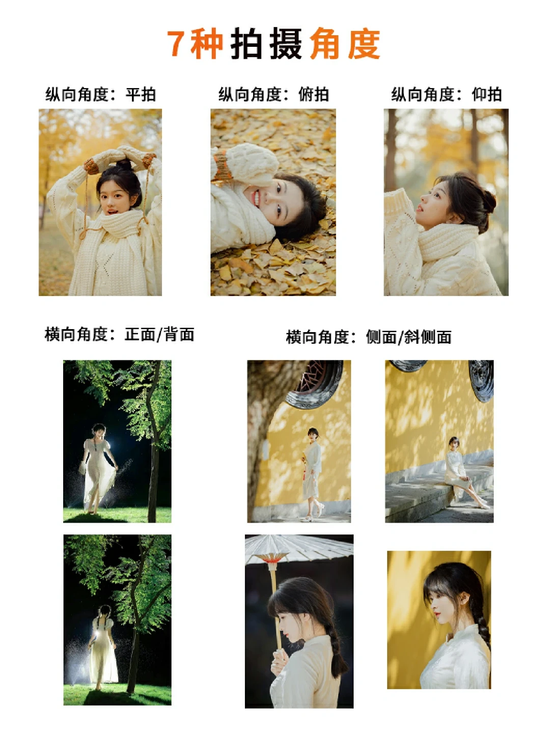 2️⃣角度:平拍/仰拍/俯拍/正面/背面/斜侧面/侧面 角度过于重复会显得整组图片不够灵活,从不同角度,结合不同的姿势,可以解锁超多新图片哦~