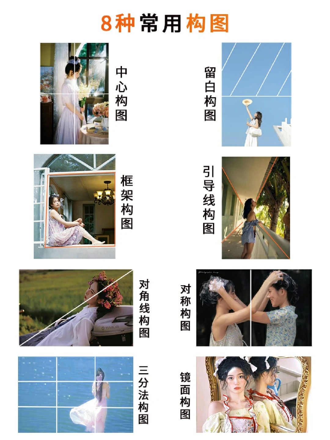 1️⃣构图:中心/三分线/框架/对角线/引导线/镜面/对称/留白构图 这是较为常用的8个构图方式,除此以外,还有三角构图、前景构图等等。
