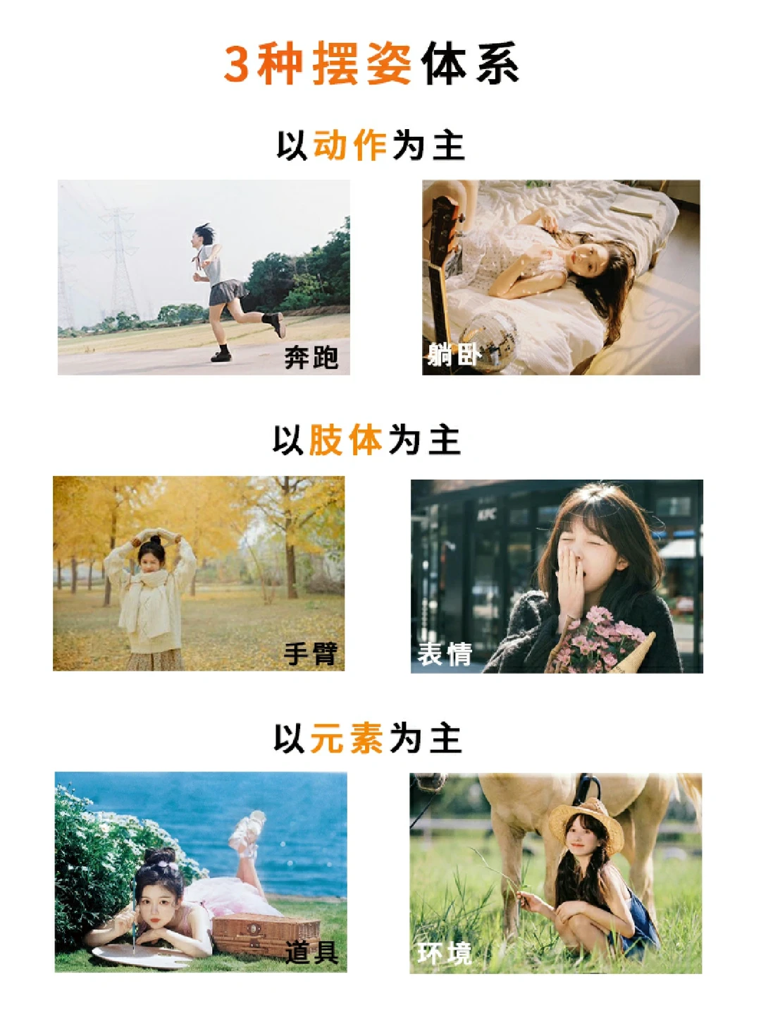 7️⃣摆姿:站/坐/蹲/躺/走/跑等动作;环境/道具/自身等元素;躯干/手臂/后背/眼神/嘴唇等肢体