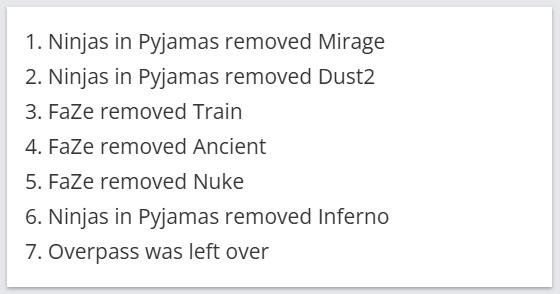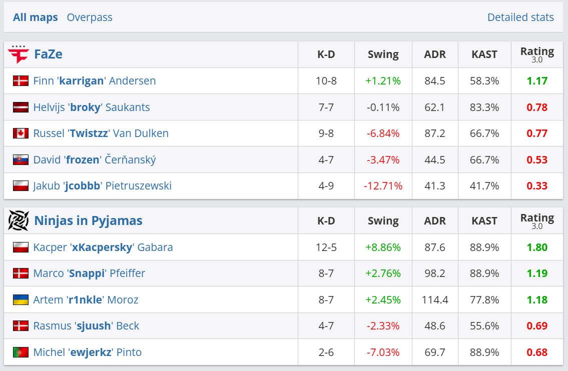 上半场FaZe尽管karrigan打出亮眼表现但全队在CT方开局防守不佳反观NIP进攻思路明确最终比分定格在4-8
