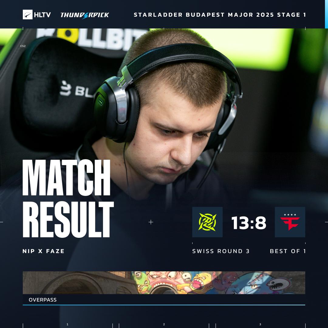 下半场FaZe虽然拿下手枪局但并没有持续拿分NIP抓住机会步步为营最终NIP以13-8击败FaZe晋级2-1组