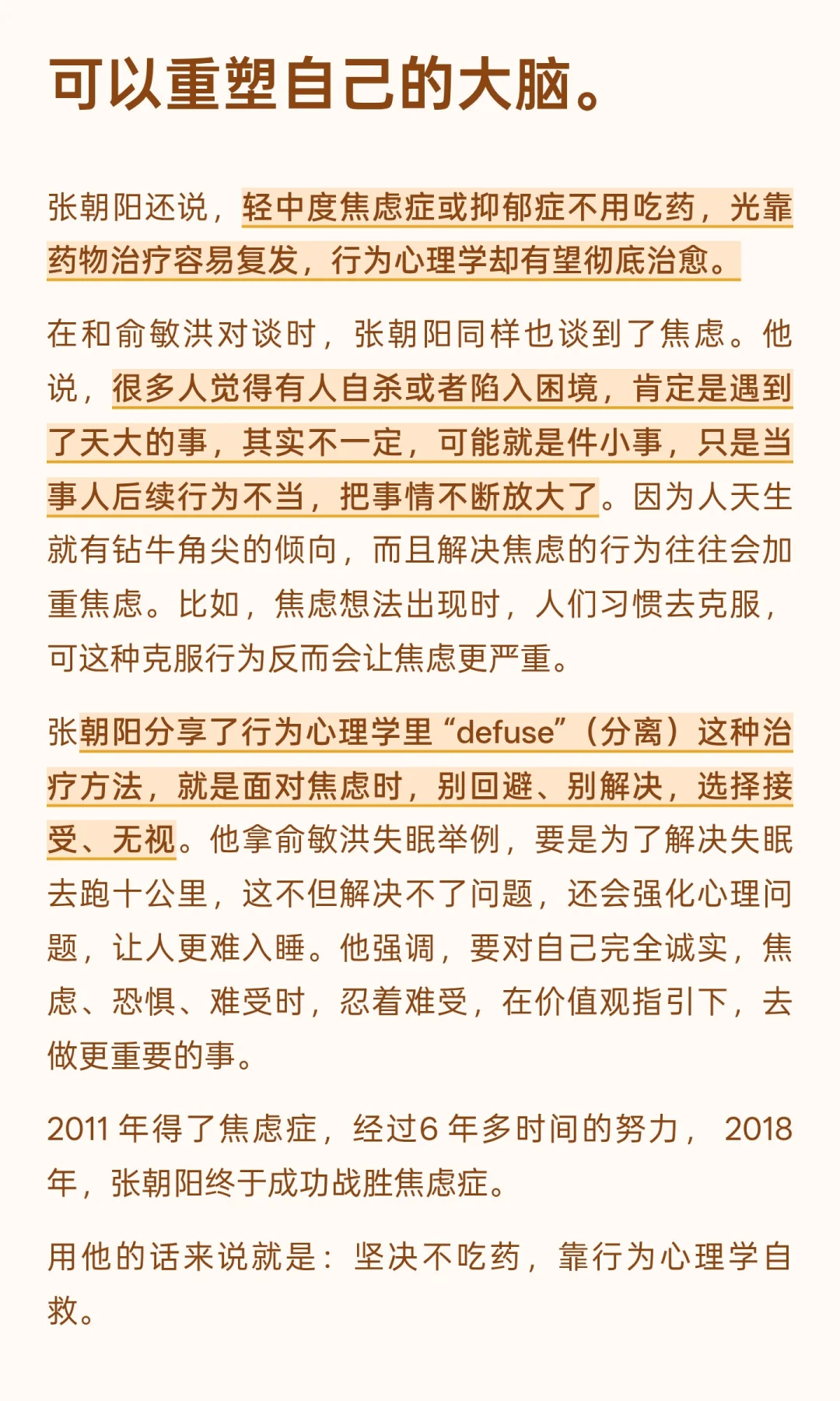 张朝阳分享了行为心理学里 “defuse”(分离)这种治疗方法,就是面对焦虑时,别回避、别解决,选择接受、无视。他拿俞敏洪失眠举例,要是为了解决失眠去跑十公里,这不但解决不了问题,还会强化心理问题,让人更难入睡。他强调,要对自己完全诚实,焦虑、恐惧、难受时,忍着难受,在价值观指引下,去做更重要的事。