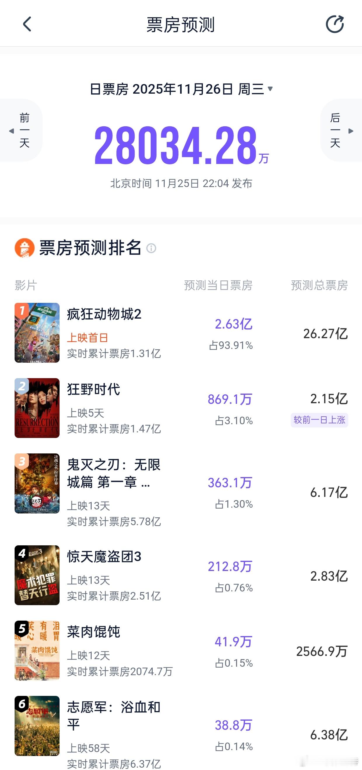 猫眼灯塔专业版预测首日《疯狂动物城2》2.6亿+,总票房25亿+