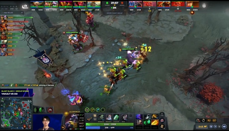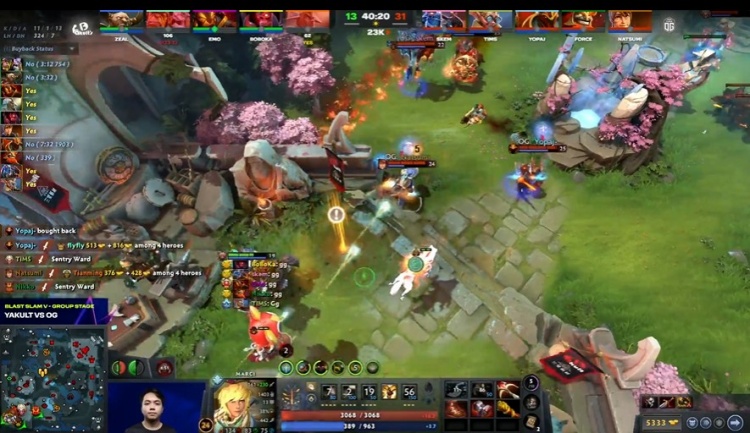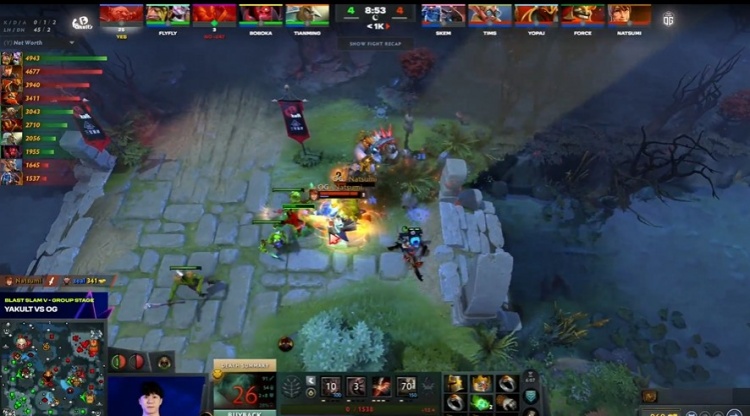 [25分钟]OG下路集结,flyfly炼金被Yopaj龙骑士跳晕先手集火,boboka暗影恶魔所在地方较远,卡在了Nikko玛尔斯大招外救不了炼金,炼金倒地后,Natsumi玛西、龙骑士和玛尔斯分散收割,将辅助留下,YB减员三人,OG乘胜下路上高,拆掉下路高地,经济一波反超到5K。