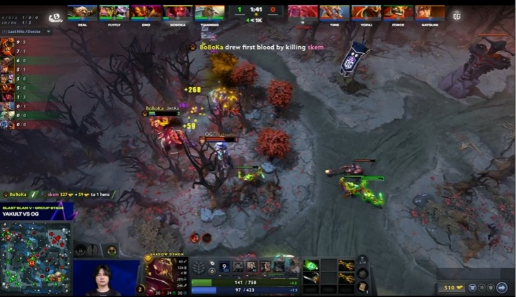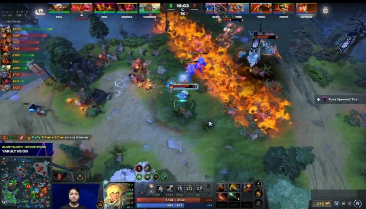 [17分钟]OG加快进攻节奏,Yopaj龙骑士晕到Emo火猫,冲脸完成击杀后,快速打掉肉山,Natsumi玛西带盾。OG经济领先1K。