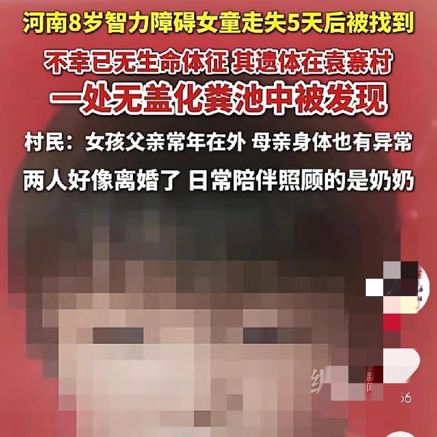 真的越想越揪心, 河南8岁女童走失5天, 最后竟在没盖盖的化粪池里找到,一条小生命就这么没了,太让人难受了。 很多人骂奶奶拴孩子、看护不当,可没人想过70多岁老人独自带两个智力有问题的孙女,儿子打工养家,儿媳离异再嫁,她不靠绳子咋看得爱乱跑的孩子? 化粪池就铺块破塑料布,盖子不知所踪,这样的安全隐患在农村不算少见,出事只是早晚的事。事后各村排查化粪池、送定位手环。 别再苛责老人,该反思的是农村的安全隐患,特殊家庭的帮扶缺失。你们觉得该怎么保障农村特殊儿童的安全?走失女童 女童走失 女孩走失 辽宁走失女童 8岁孩子失踪 8岁女童丢失