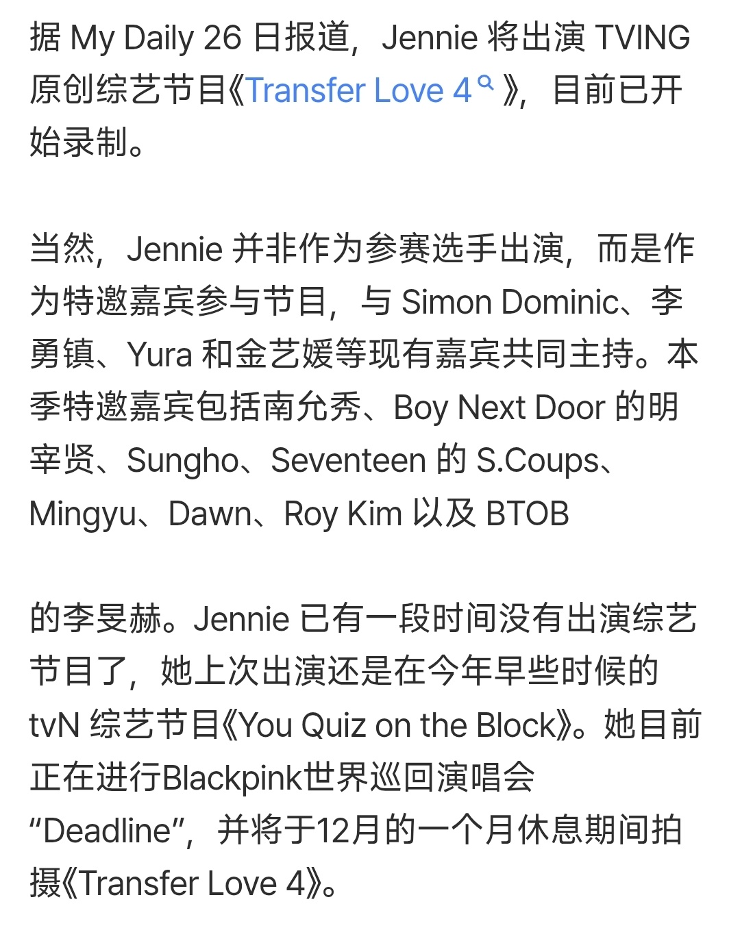 251126 Jennie韩网新闻一则🐱【独家】意想不到的组合……Jennie将出演《换乘恋爱4》“据My Daily 26日报道,Jennie将出演 TVING 原创综艺节目《换乘恋爱4》,目前已开始录制。当然,Jennie 并非作以参演者的身份出演,而是作为特邀嘉宾参与节目…Jennie 已有一段时间没有出演综艺节目了,她上次出演还是在今年早些时候的 tvN 综艺节目《You Quiz on the Block》。她目前正在进行BLACKPINK世界巡回演唱会“Deadline”,并将于12月的一个月休息期间拍摄《换成恋爱4》。”啊啊啊啊小妮的新综艺来啦🤩🤩🤩