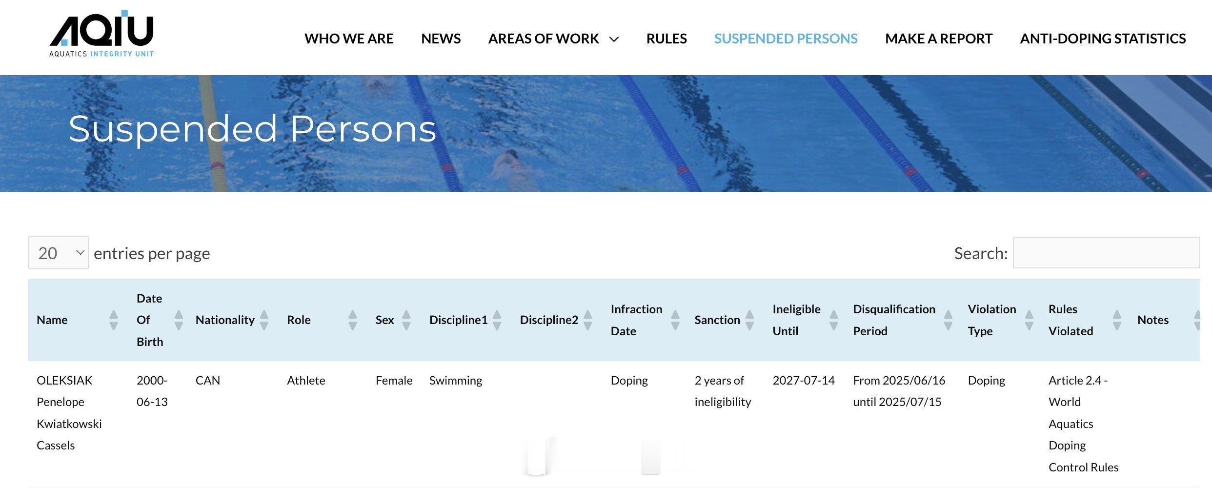 加拿大🇨🇦奥运冠军Penny Oleksiak由于三次未报告行踪被予以两年禁赛处罚,禁赛期至2027年7月14日