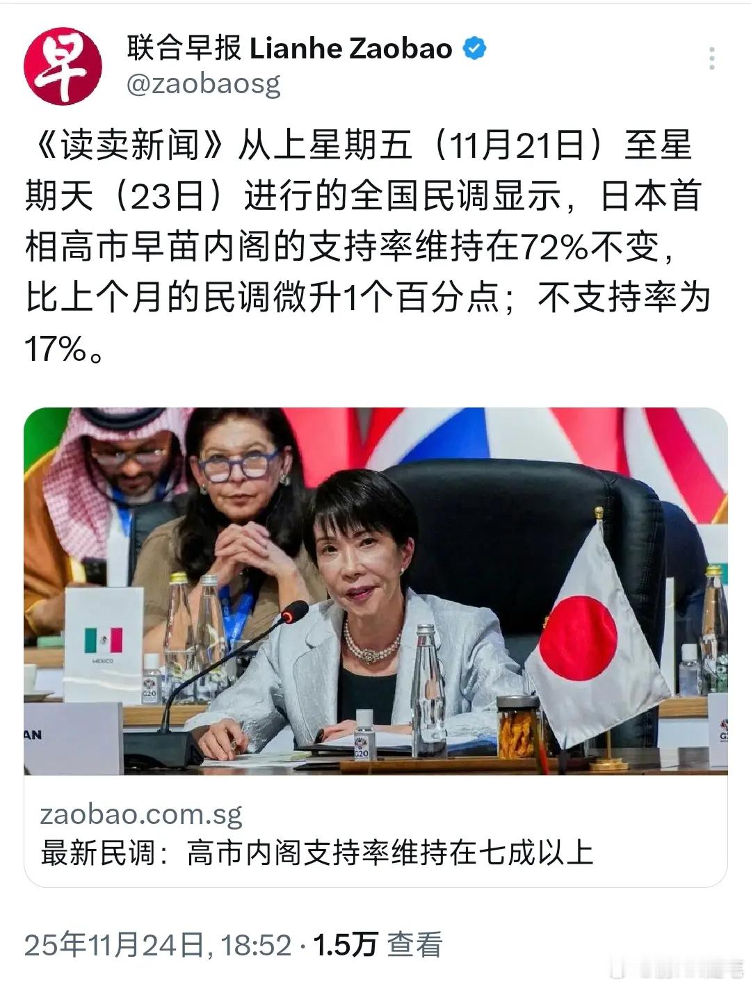 把挑衅强国当勇气,日本75.2%的民意狂欢,实则是自我毁灭的邪路!日本媒体报道,FNN民调显示高市早苗内阁就职月余支持率高达75.2%,更有超60%受访者认可其对台湾紧急情况的应对“恰当”,这组数据是右翼势力抬头、信息茧房桎梏下的危险信号。高市早苗靠煽动对华对立、煽动台海议题换取支持的路径,本质是重蹈军国主义覆辙的邪路,既违背历史潮流,更将日本推向万劫不复的深渊。高市早苗的高支持率,是右翼毒瘤与军国主义幽灵复活的直接佐证。作为政治根基本就薄弱的弱势首相,她在改善民生、提振经济赢得民心方面没有啥办法,反而复刻了当年日本军国主义内患外引的卑劣伎俩;将“台湾有事”与日本“存亡危机事态”强行绑定,通过渲染“中国威胁论”制造恐慌,以粗暴干涉中国内政的姿态巩固政治地位 。这种靠煽动民族主义、挑动地区冲突换取支持的操作,与二战前日本军国主义借对外扩张转移国内矛盾的行径如出一辙。在其主导下,防卫预算持续加码,甚至计划删除“无核三原则”中的“不引进”条款,允许美军核武器入境,种种举动都暴露了突破战后和平框架、推动再军事化的危险野心,而75.2%的支持率,恰恰成为右翼势力壮大的“民意背书”。信息茧房的桎梏与实力认知的错位,让日本陷入自我麻痹的荒诞境地。客观数据不会说谎,中国经济规模是日本的数倍,工业产值占全球31%,而日本综合国力不足中国1/5;军力层面,中国舰艇数量和吨位,是日本的近5倍,战机规模超3300架,哪怕5代机数量都超过日本在役战机之和,形成碾压级优势,更拥有日本不具备的核威慑力量与完整国防工业体系。经济上,中国是日本最大贸易伙伴、最大市场和最重要供应地,最重要的旅游客户来源地,其经济复苏高度依赖对华合作。但在日本右翼主导的舆论环境中,这些基本事实被刻意遮蔽,“中国威胁论”的虚假叙事充斥媒体,形成密不透风的信息茧房。民众在缺乏全面信息的情况下,误将挑衅中国内政的危险行径视作维护安全,这种认知错位不仅让日本社会丧失了理性判断能力,更使其在对华政策上走向“战略盲动”。这个国家有战术无战略,小时精明、大事糊涂的毛病又犯了。押注美国、干涉台海的混蛋逻辑,是日本以国家命运为赌注的疯狂豪赌。高市早苗内阁的对华强硬姿态,背后始终有对美同盟的虚幻依赖。他们天真认为,只要抱紧美国“大腿”,加入“日美+N”军事合作框架,就能获得介入台海的底气。但这种“狐假虎威”的算计,本质是将日本的国家安全寄托于他国战略利益之上。美国的全球战略从来以自身利益为核心,历史早已证明,盟友不过是其地缘博弈的棋子。一旦台海局势生变,日本所谓的“安全保障”将瞬间崩塌,反而会因主动卷入冲突沦为战场前沿。无视二战结果、挑衅核大国红线,暴露了日本右翼的历史观缺乏清算与战略短视。作为二战战败国,日本本应深刻反省侵略历史,尊重受害国的主权与安全关切。但高市早苗内阁却执意将台湾问题作为政治工具,为两岸分裂摇旗呐喊,本质上是不接受二战战败于中国的既定事实、也不承认中国作为核大国的国际地位。台湾是中国不可分割的一部分,这是国际社会公认的事实,更是写进中日四个政治文件的核心共识。日本在台海问题上的挑衅,触碰了中国的核心利益红线。中国核威慑力量与现代化国防体系绝非摆设,日本妄图以“押上国家命运”的方式干涉台海,无异于以卵击石。2025年是中国人民抗日战争暨世界反法西斯战争胜利80周年,在这一敏感历史节点,高市早苗内阁的“邪路”行径更具警示意义。高市早苗75.2%的支持率不是荣耀,而是日本社会的悲哀,是全民精神病态的前兆。