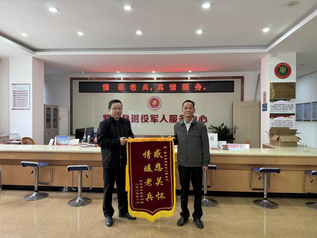 近日,退役军人张燕湖将一面印有“感恩关怀情暖老兵”的锦旗送至紫金县退役军人事务局,表达对工作人员热情服务和为其成功申请省退役军人应急救助资金、缓解家庭困难的感激之情。