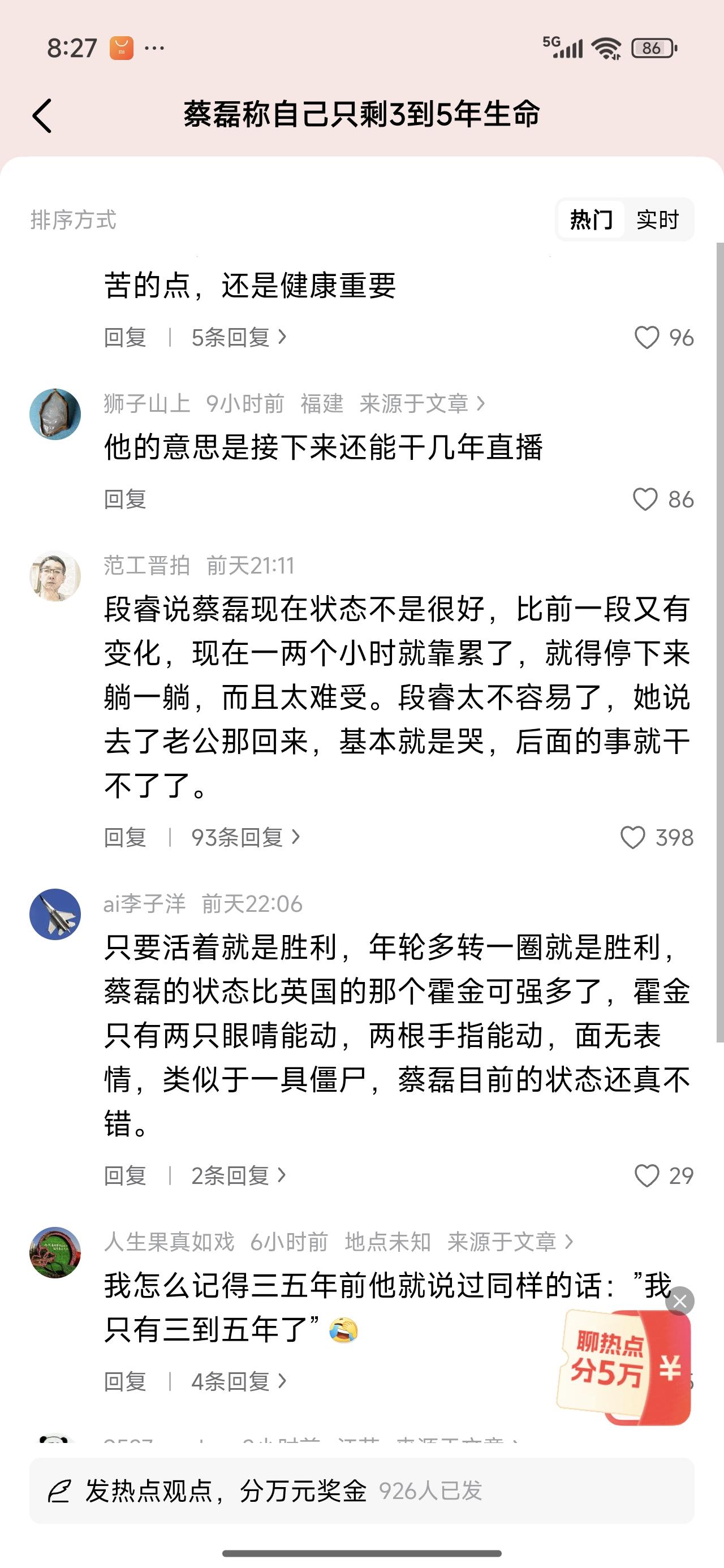 蔡磊发声:自己还有三到五年时间。 对于渐冻症患者来说,活活不成,死也死不了。很多人面临的都是这个处境。 只要家里人照顾的好,生存期还是有个几年的。 很多人说蔡磊胖了,我看他那脸上的肉,没有力气,是肥膘肉,不咋能动,所以,肌肉含量少。 他真真是病了,什么类型的渐冻症,咱不知道。但一定是病了。 只是,他有钱,照顾的算好。也就能比平常人多活几年。 他的研究成果,暂时还没有啥成果。起码对他来说,没见到效果。 说他媳妇带的货,买过一次玉米,还将就。没退货。剩下的,大家来说。 珠宝我买不起。 是不是左江独董,大概吧!网上给出了模棱两可的答案。 原先都挣了钱的,两口子都是人精。是不是当世的福祸报就不得而知了。 人各有命,如此行动不便,还不如一个穷光蛋活的自在。 假如命运垂青,不知他和穷鬼互换身体换不换?换与不换,都是另一种罪过。