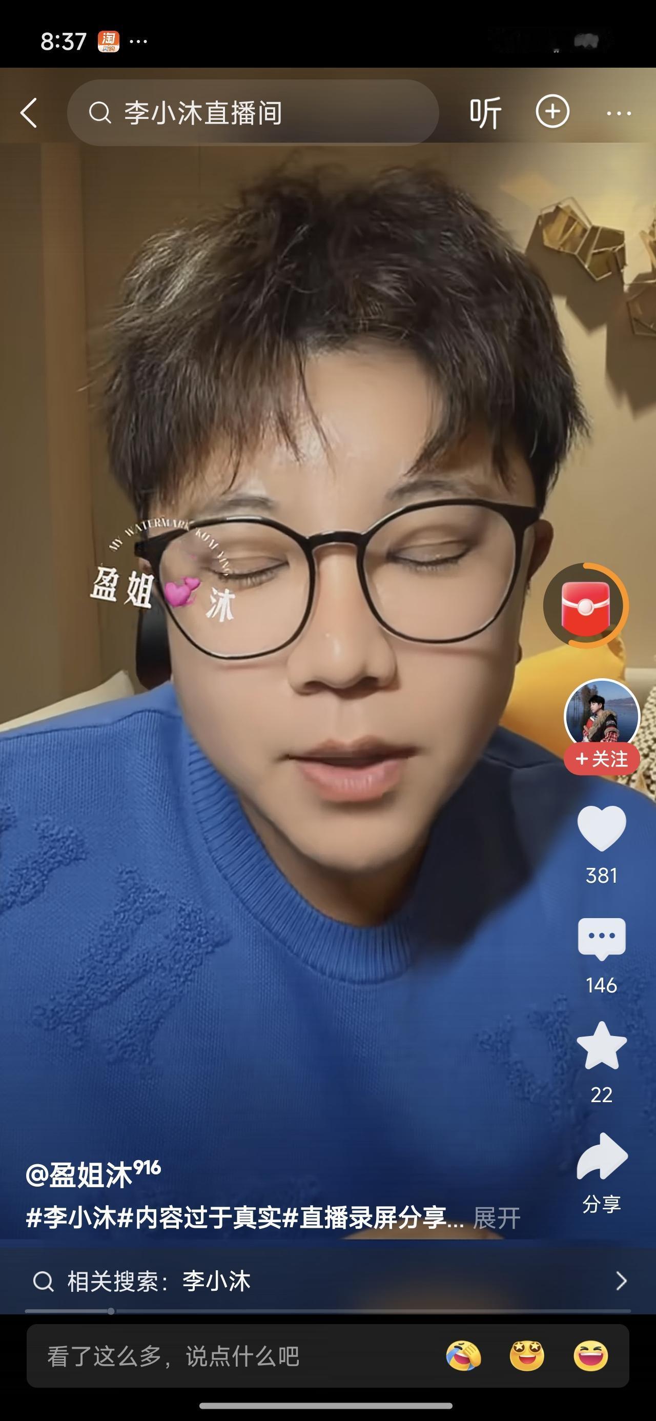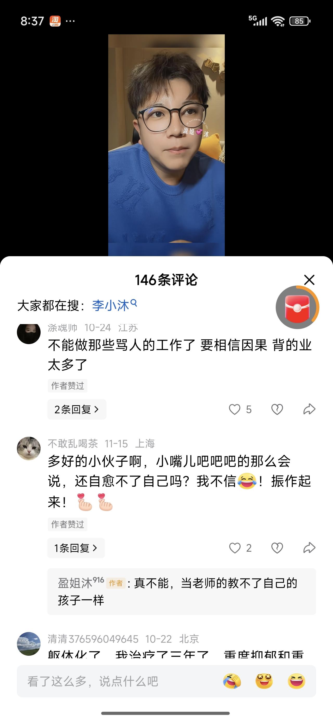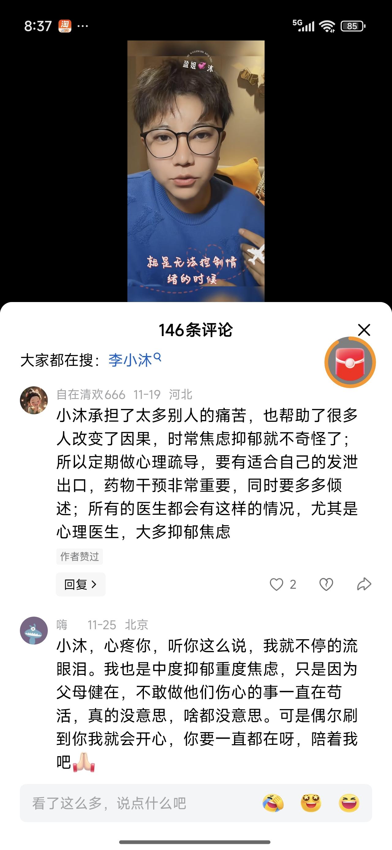 李小沐,有时候男扮女装,有时候娘 们唧唧。思想挺爷们儿的。也是个苦孩子。父母在家照顾瘫痪的哥哥,他负责养一大家子。 你了解别人越多,你就会发现,这世界,不幸福的人太多了。能吃好一餐饭,睡好一晚觉,是多么幸福的事。 小沐,最近抑郁了,在轻生与轻生之间徘徊,挣扎。 他观点可犀利了。说话老招笑了。许是许不是的,干涉了太多人的因果,把自己整混乱了。 黑白颠倒直播,他跟大冰一样,是个彻头彻尾的悲观主义者。不婚,配得感低。 这是个啥物种呢?就是内里是个极其善良的人,不相信别人,不愿意麻烦别人。能不能解决的问题,都在自己的小小神躯里自己消化。难为自己太多了。出现问题,是早晚的事。 他跟大冰又不一样,大冰有自己的逻辑和底层架构。有自己的处事哲学。小沐,修炼还不够。还得加油!
