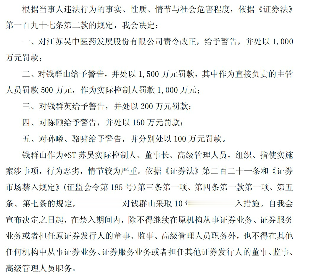 中国证监会由此对*ST苏吴责令改正,给予警告,并处以1000万元罚款;并对公司相关责任人钱群山、孙曦、骆啸、钱群英、陈颐给予警告并处以罚款。此外,*ST苏吴实际控制人、董事长钱群山被采取10年证券市场禁入措施。
