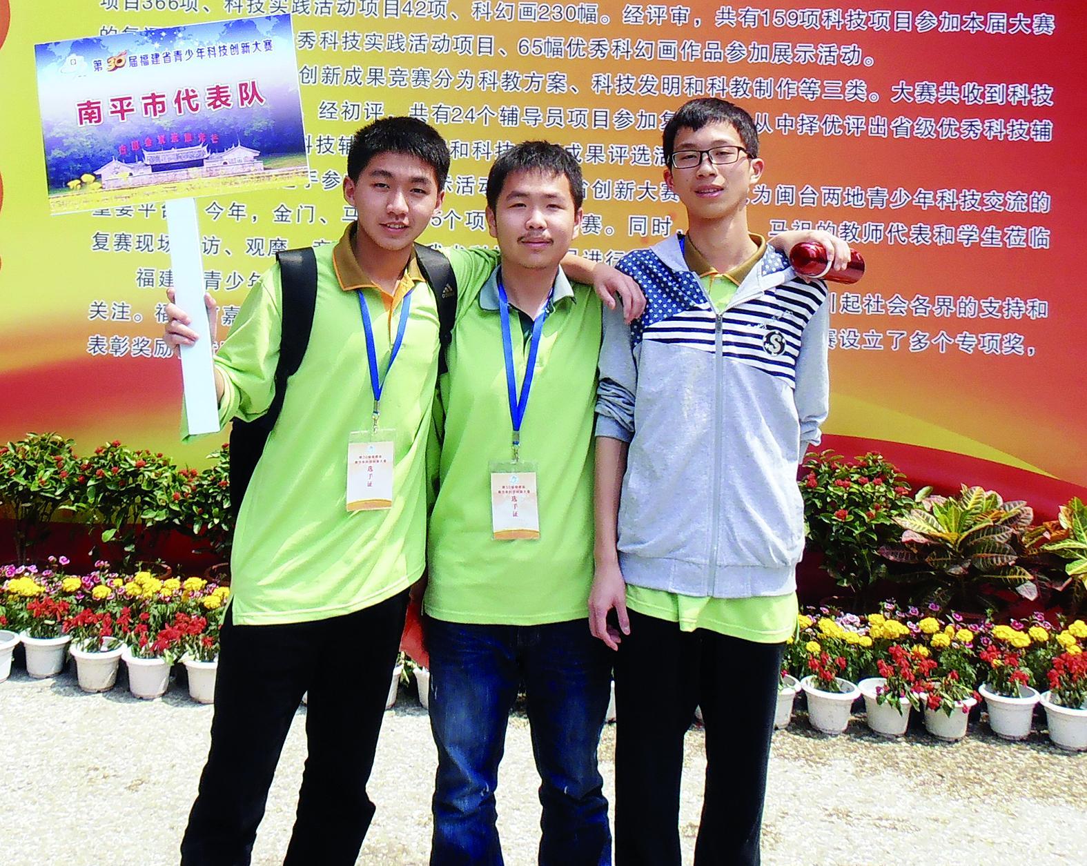 2015年4月,郭章旺、朱行杰、纪代瀚的研究成果在第30届福建省青少年科技创新大赛中获一等奖,并被授予“卢嘉锡科技创新专项奖”。图为三人获奖后合影留念。(南平一中供图)