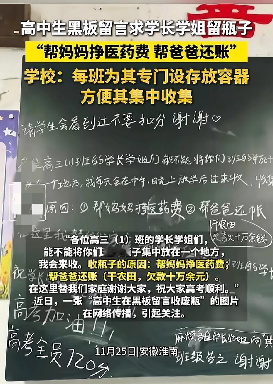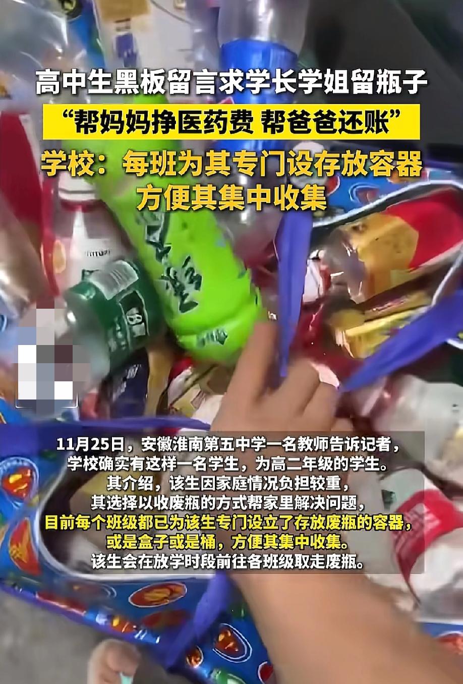 “这位小伙子以后一定能成大事!”安徽淮南第五中学的一块黑板留言,近日在网上引发热议。 一名高二学生因家庭困难,在黑板上恳请高三(1)班学长学姐将废瓶集中存放,他会定期来收,目的是“帮妈妈挣医药费、帮爸爸还十万元农田欠款”,还暖心的祝学长学姐高考顺利。 这张留言图片在网络传播后,定位显示为安徽淮南第五中学。11月25日,该校教师证实确有此事,该生因家庭负担过重,选择收废瓶帮家里解决困难。 目前学校每个班级都为其专门设置了存放废瓶的容器,或盒或桶,方便他集中收集,他会在放学时段前往各班取走废瓶。 同龄学生大多在专注学业或享受课余时光,他却背着麻袋奔波于各班收瓶。同学们也默默支持,将废瓶特意留存放入专属容器。 如今,他收瓶之路更顺畅,既能帮衬家里,也未耽误学习。 生活不易,可这个孩子却用一个个废瓶扛起家庭责任。当我们抱怨生活琐碎时,想想还有人在为家人的生计从瓶瓶罐罐里攒希望,便知每一份为生活的打拼都值得尊重。 我们是否也该多些担当与感恩,在自己的人生里更用力地向前?