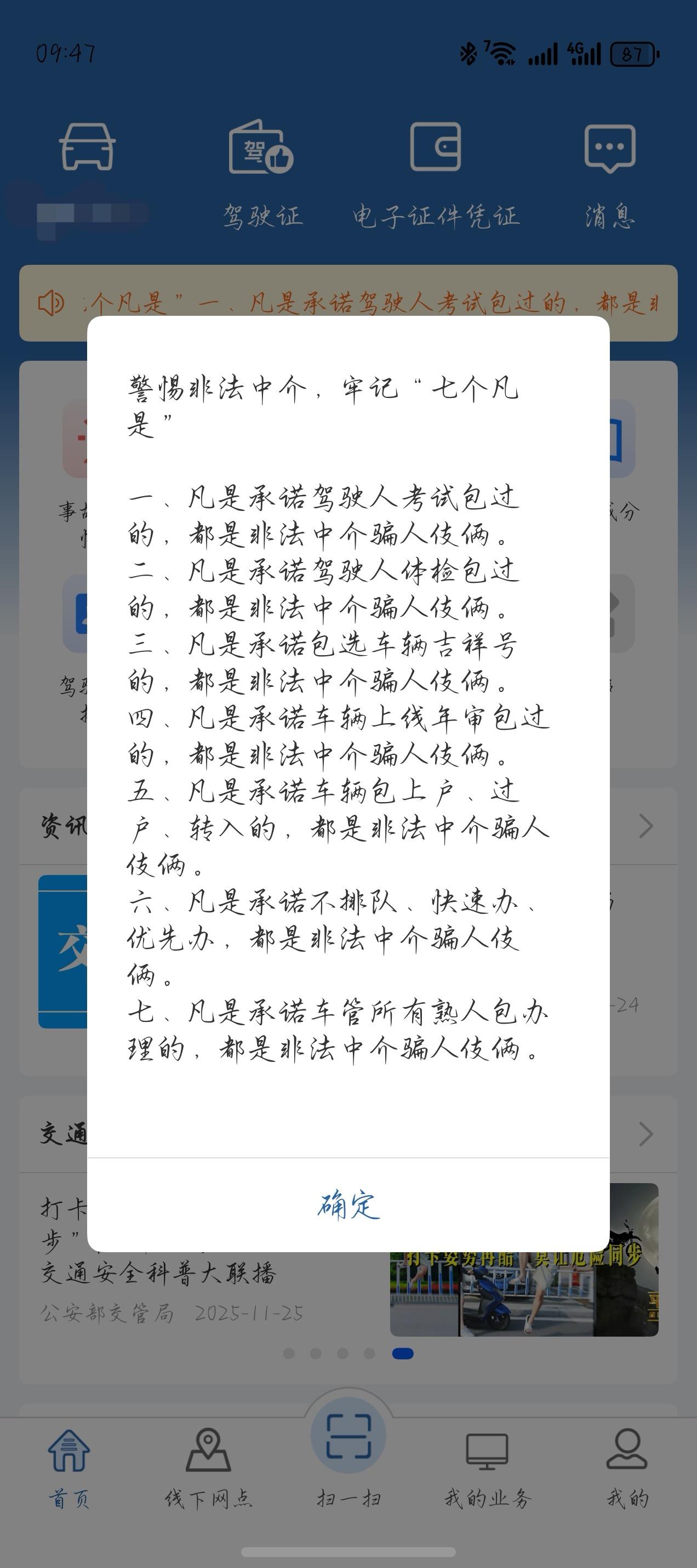 有车的朋友请注意,今天进入交管12123就弹出七个凡是提醒,刷抖音又看到人民日报关于车辆年检的说明,真的很有用哦! 七个凡是:一、凡是承诺驾驶人考试包过的,都是非法中介骗人伎俩。二、凡是承诺驾驶人体检包过的,都是非法中介骗人伎俩。三、凡是承诺包选车辆吉祥号的,都是非法中介骗人伎俩四、凡是承诺车辆上线年审包过的,都是非法中介骗人伎俩五、凡是承诺车辆包上户、过户、转入的,都是非法中介骗人 伎俩。六、凡是承诺不排队、快速办优先办,都是非法中介骗人伎 俩。七、凡是承诺车管所有熟人包办 理 年检10年内只要第六年去检测站上线检测,其他最多只要去12123上申领电子年检标志,详细请看图! 希望有车的朋友看到,能帮到你们! 年检 交管12123APP