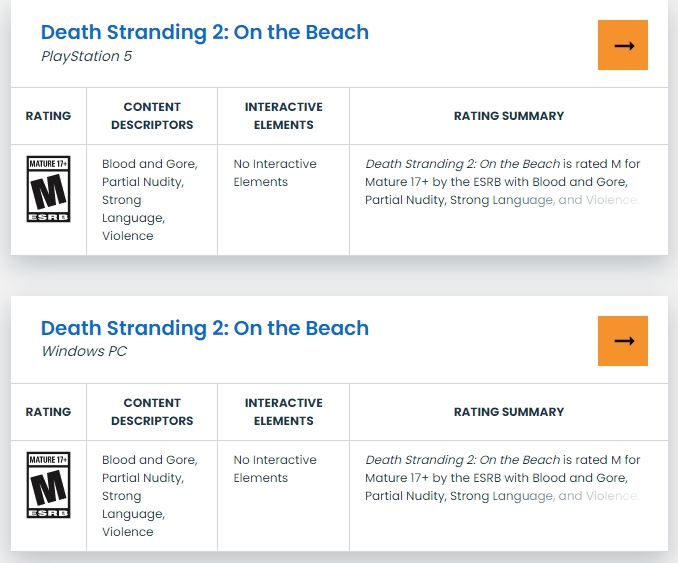 【《死亡搁浅2》PC版ESRB评级出炉,PS5独占即将结束?】今日《死亡搁浅2 冥滩之上》在ESRB评级官网上出现了PC版的评级内容,或将登陆PC平台。“《死亡搁浅 2:海滩》由ESRB评为M级(成人 17+),包含血腥暴力、部分裸露、粗口和暴力内容。这是一款动作游戏,玩家扮演快递员(山姆·波特·布里奇斯),试图在一个后末日世界中重建社会。游戏采用第三人称视角,玩家在一个开放世界地图中运送各种货物和包裹。途中,玩家可以与人类士兵战斗、对抗机器人以及与幽灵般的幻影战斗。玩家使用近战武器(例如战斗吉他)和远程武器(例如机枪、狙击枪)来消灭敌人。玩家还可以使用潜行暗杀技巧来隐蔽地制服士兵。战斗有时会非常激烈,伴随着逼真的枪声、血溅和慢动作效果。某些场景描绘了额外的暴力和/或血腥场面:一个男人的手脚被机器人武士砍断;一个男人以奇幻的方式被点燃;一个男人被巨型机器劈成两半。游戏中可以听到“f**k”这个词语。”