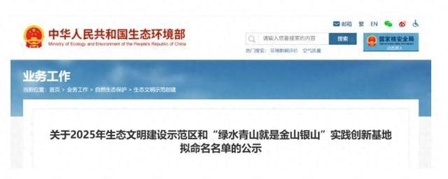 为公开、公平地开展生态文明建设示范区和“绿水青山就是金山银山”实践创新基地评选工作,现对2025年生态文明建设示范区和“绿水青山就是金山银山”实践创新基地拟命名名单进行公示: