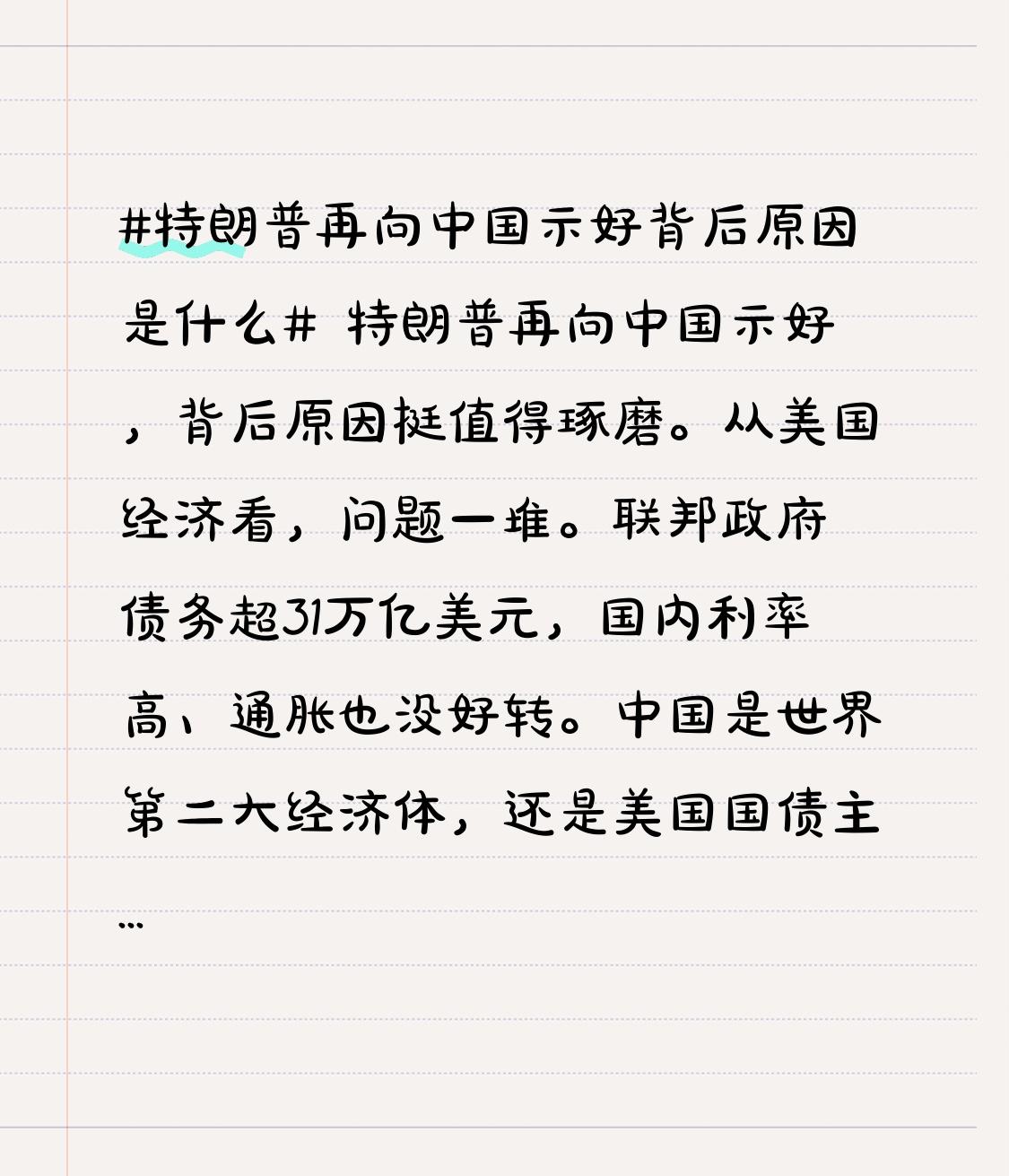 特朗普再向中国示好,背后原因挺值得琢磨。从美国经济看,问题一堆。联邦政府债务超31万亿美元,国内利率高、通胀也没好转。中国是世界第二大经济体,还是美国国债主要债权方,美国经济需要和中方加强合作。 同时,美国企业也不希望打关税战。像马斯克等企业家,极其不希望特朗普对中方加关税,媒体也指出“关税战不利于在华美企”,特朗普似乎也意识到贸易战没赢家。另外,中方近期强大装备和一带一路外交成果,也让他明白得和中方友好相处。看来,美国这是多方面权衡后,想对华缓和关系了。 不过,特朗普的示好是否真心实意还得打个问号。他一直以来行事风格反复无常,过往的种种操作让其信誉大打折扣。说不定在某些利益集团的施压下,或者为了美国国内的政治作秀,他随时可能又转变态度。 而且,美国国内政治环境复杂,不同党派、不同势力之间矛盾重重。即便特朗普有缓和对华关系的想法,也会面临巨大的内部阻力。那些视中国为“竞争对手”的强硬派政客,必然会对特朗普的示好举措百般阻挠,试图将中美关系拉回紧张状态。 从国际层面来看,美国还想在全球维持霸主地位,而中国的崛起无疑是其“眼中钉”。这种大国竞争格局短期内难以改变,特朗普或许只是在当前形势下做出的短暂妥协。一旦美国经济有所好转,或者找到新的国际战略着力点,对华政策可能又会出现变数。 未来中美关系走向依旧迷雾重重,是在特朗普示好下逐渐趋于缓和,还是再次陷入紧张对峙,我们还需持续关注美国各方动态以及中美之间的具体互动。