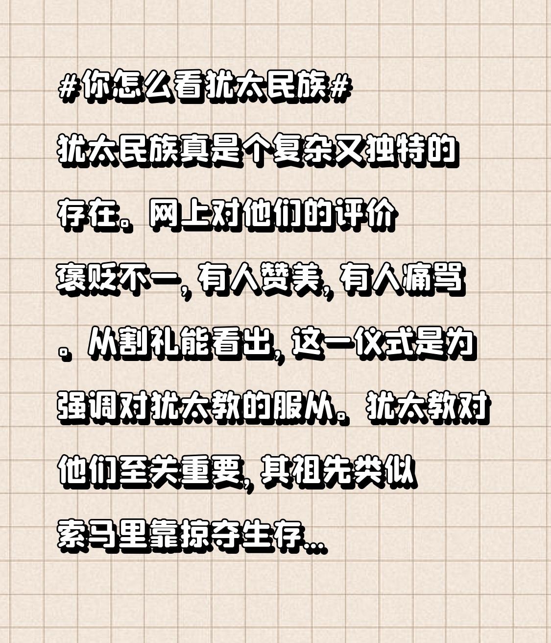 犹太民族着实是一个复杂且独特的存在。网络上对他们的评价毁誉参半,有人对其赞美有加,有人则对其痛加斥责。从割礼便能看出,这一仪式旨在强调对犹太教的遵从。犹太教对他们而言至关重要,他们的祖先类似靠掠夺为生的索马里人,由于自然环境恶劣,长期的掠夺行为得罪了周边人群,加之自身实力弱小而充满危机感,于是便借助宗教来凝聚人心。 犹太教有着诸多规定,如同伊斯兰教般教条,通过强化心理暗示来增强凝聚力,使这个民族在困境中更显坚韧。不过,在生存时期他们或许动物属性更为突出,为了生存采取了一些极端举措。但他们的智慧与坚韧同样不可小觑,在诸多领域都取得了卓越成就。 从历史的长河来看,犹太民族在金融领域的影响力堪称传奇。罗斯柴尔德家族便是典型范例,他们凭借敏锐的商业洞察力和出色的金融运作能力,构建起了横跨欧洲的金融帝国。家族成员巧妙地利用信息差,在债券市场上兴风作浪,积累了巨额财富。这种在金融界的游刃有余,让犹太民族成为全球经济舞台上不容忽视的力量。 在科技和学术领域,犹太裔科学家更是璀璨夺目。爱因斯坦提出的相对论,彻底颠覆了人们对时空的认知,为现代物理学的发展奠定了基石;弗洛伊德开创的精神分析学派,开启了人类潜意识的大门,深刻影响了心理学的发展。他们以独特的思维和创新精神,推动着人类文明不断向前发展。 然而,犹太民族的发展并非一路坦途。历史上,他们多次遭受迫害与驱逐,“二战”期间纳粹德国对犹太人的大屠杀更是惨无人道。但即便如此,他们依旧没有被打倒,反而在苦难中愈发坚强。他们凭借对教育的重视和对知识的渴望,在世界各地重新立足,继续书写着属于自己的辉煌篇章。 总体而言,犹太民族宛如一颗充满矛盾却又光彩照人的宝石,其独特的历史、文化和民族特性,值得我们深入探究与思索。我们应当以客观、全面的视角去看待他们,既欣赏他们的智慧与成就,也理解他们曾经的艰难与不易。