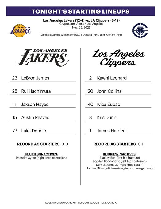 本赛季首回合洛杉矶德比,12点开打!双方首发公布:快船—哈登,邓恩,伦纳德,科林斯,祖巴茨湖人—东契奇,里夫斯,八村塁,詹姆斯,海斯