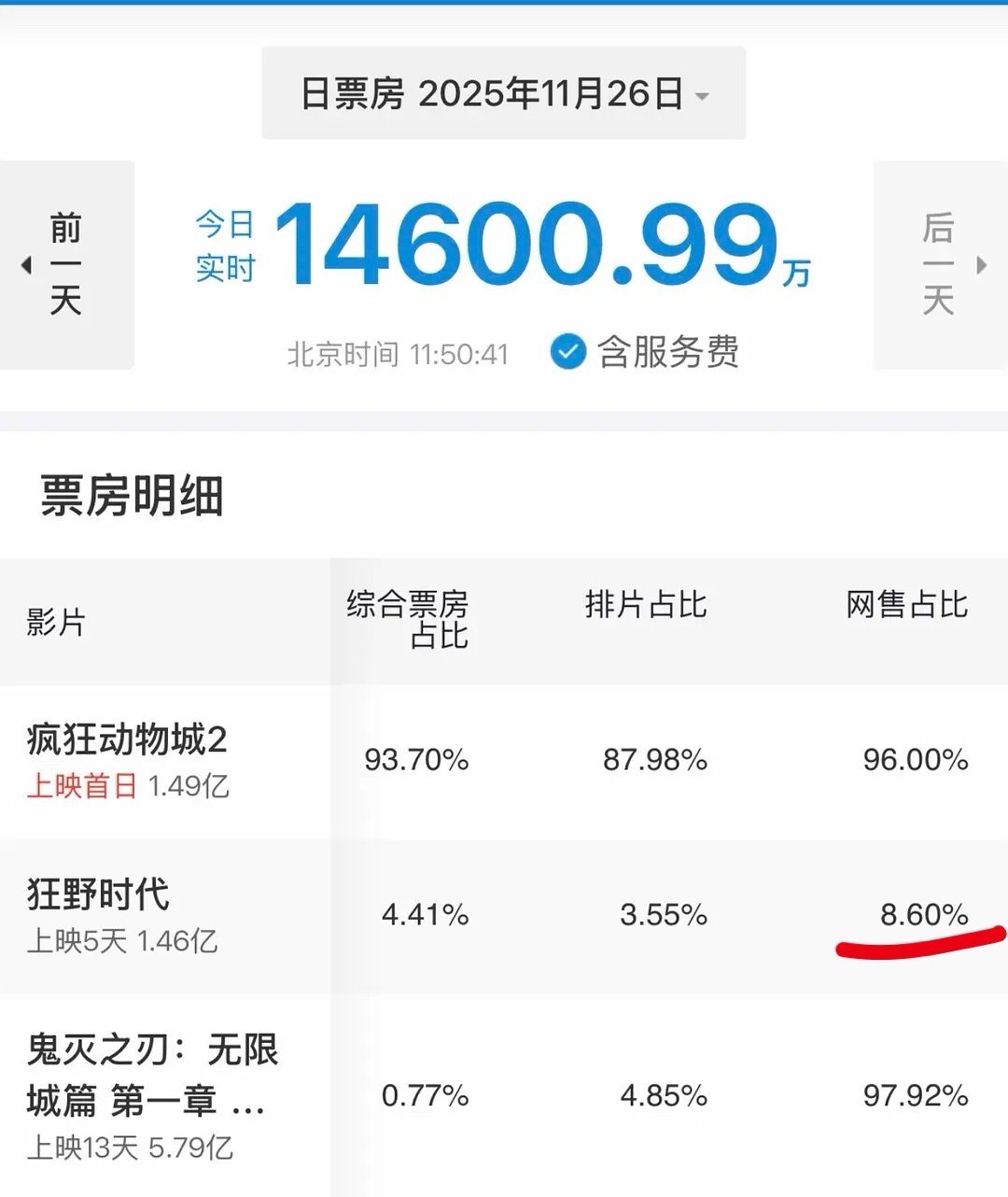 第五日中午11:50分 《狂野时代》网售比8.6%