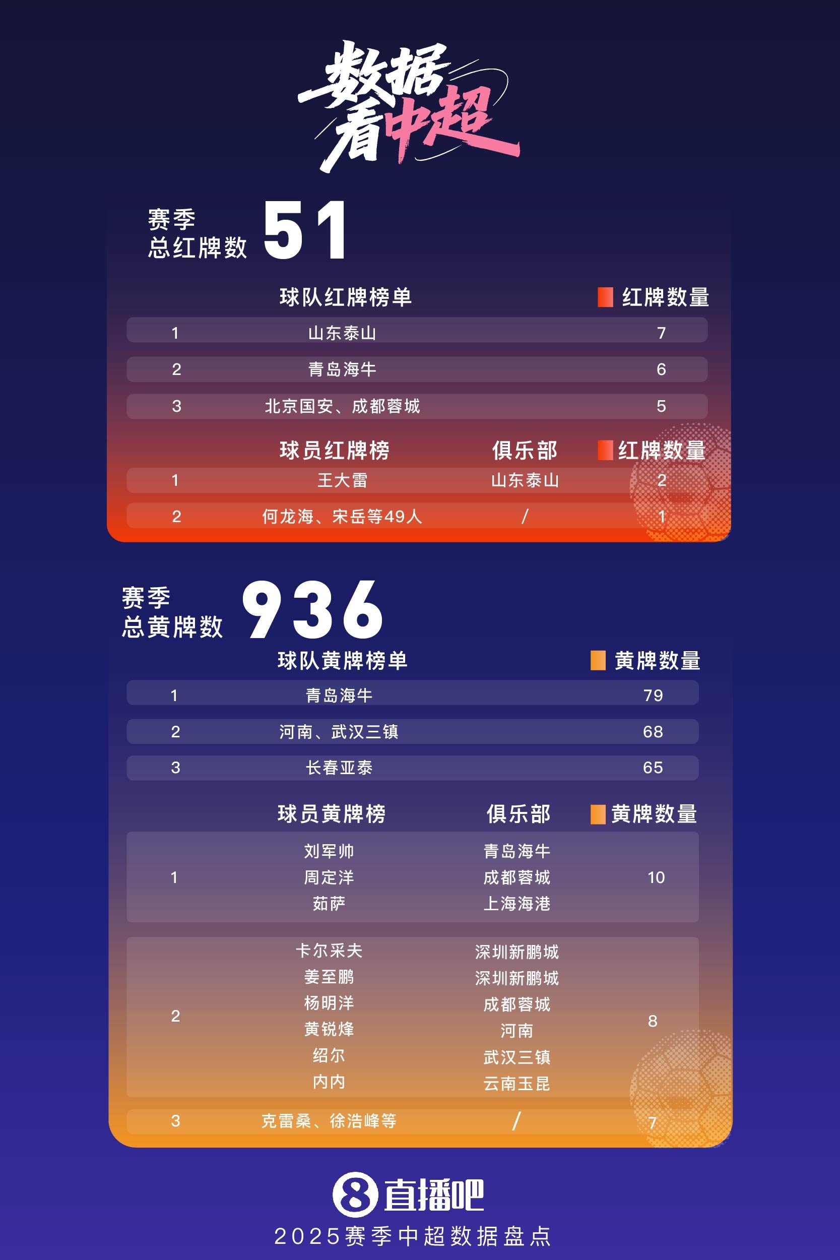 数据看中超|赛季红牌51张 泰山7张红牌领跑 王大雷2次染红最多