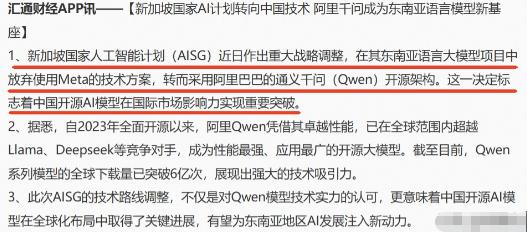 太给力了!中国AI刚刚完成了一次漂亮的"出海远征"!   就在这两天,新加坡国家级人工智能计划正式宣布,全面采用我国自主研发的通问千义大模型,取代了之前使用的美国Meta技术!     新加坡刚刚做出的那个决定,无疑就是这场战役的转折点,这不是一次简单的商业采购,而是技术疆域的一次硬核更迭:新加坡国家人工智能计划在最新的战略调整中,断然舍弃了美国Meta的技术路线,转身全面拥抱来自中国的阿里通义千问,这一举动,就像是在原本由西方主导的科技版图上,撕开了一道光辉的口子。   要知道东南亚的语言环境简直是人工智能的“噩梦级”考场,这里泰语、印尼语、马来语等各种方言交织缠绕,语境复杂多变,以往那些在硅谷实验室里“娇生惯养”的西方模型,一旦落地到这片复杂的语言土壤,往往就会因为“水土不服”而效率大打折扣。   而这次让新加坡毅然改旗易帜的关键,正是因为中国的千问大模型在这片土壤里表现出的惊人适应力,它在处理这些复杂东南亚语系时的分词效率,竟然比西方竞品高出了40%以上,这已经不仅仅是技术的胜利,更是中国科技对复杂场景理解深度的最佳证明。   更耐人寻味的是,这种“弃美投中”的趋势早已不是孤例,而是一场在硅谷眼皮底下发生的全球突围,甚至连苹果、亚马逊这些一向高傲的科技巨头,都在悄悄将这项中国技术纳入自己的底层架构中。   Airbnb的掌门人毫不掩饰地称赞我们的模型“比OpenAI更具性价比”,也能看到英伟达的黄仁勋频频为中国AI算力点赞,数据是不会撒谎的,全球6亿次的下载量,衍生出超过17万个模型变体,从东京的写字楼到阿联酋的沙漠城市,全球开发者正在用键盘投票,这种从追赶到领跑的既视感,很难不让人联想到当年中国高铁和5G通信冲出国门时的那些辉煌瞬间。   这一纸来自新加坡的“录用通知书”,对于背后的中国产业链来说,更是一张含金量十足的“国际通行证”,它意味着整个AI出海舰队已经完成了集结,并开始在这场技术远征中尝到实打实的甜头。   把目光投向这庞大产业链的后台,会看到一个精密咬合的巨型机器正在全速运转:浪潮信息作为幕后推手,正以惊人的产能支撑着模型90%的训练任务,其液冷方案正好解决了算力爆发后的高能耗痛点;而中际旭创提供的800G光模块,则像血管一样保障着多语言交互极度依赖的低延迟体验。   而在更深层的算力基建上,一支“工兵军团”早已在东南亚扎下了根,润建股份正忙着在那边运维着高达6000个机柜的算力节点,直接参与到这场跨国算力的调度之中;数据港更是手握着160亿的长周期订单,他们的推理算力集群正在为中国AI在当地的部署提供最坚实的“地基”。   有了这些硬核支撑,应用层面的玩家们才敢在前端大展拳脚,蓝色光标和易点天下,利用大模型的生成能力,已经开始批量生产印尼语的电商文案,甚至制造虚拟主播进行24小时不间断的带货,让中国品牌在出海的路上如虎添翼,法本信息则在这个过程中,通过精准的多模态数据标注,不断打磨着AI的“大脑”,让它越来越懂当地的风土人情。   事实证明,当底层技术真正撕开缺口,整条产业链上的每一个环节,都会迎来属于它们的红利爆发期。