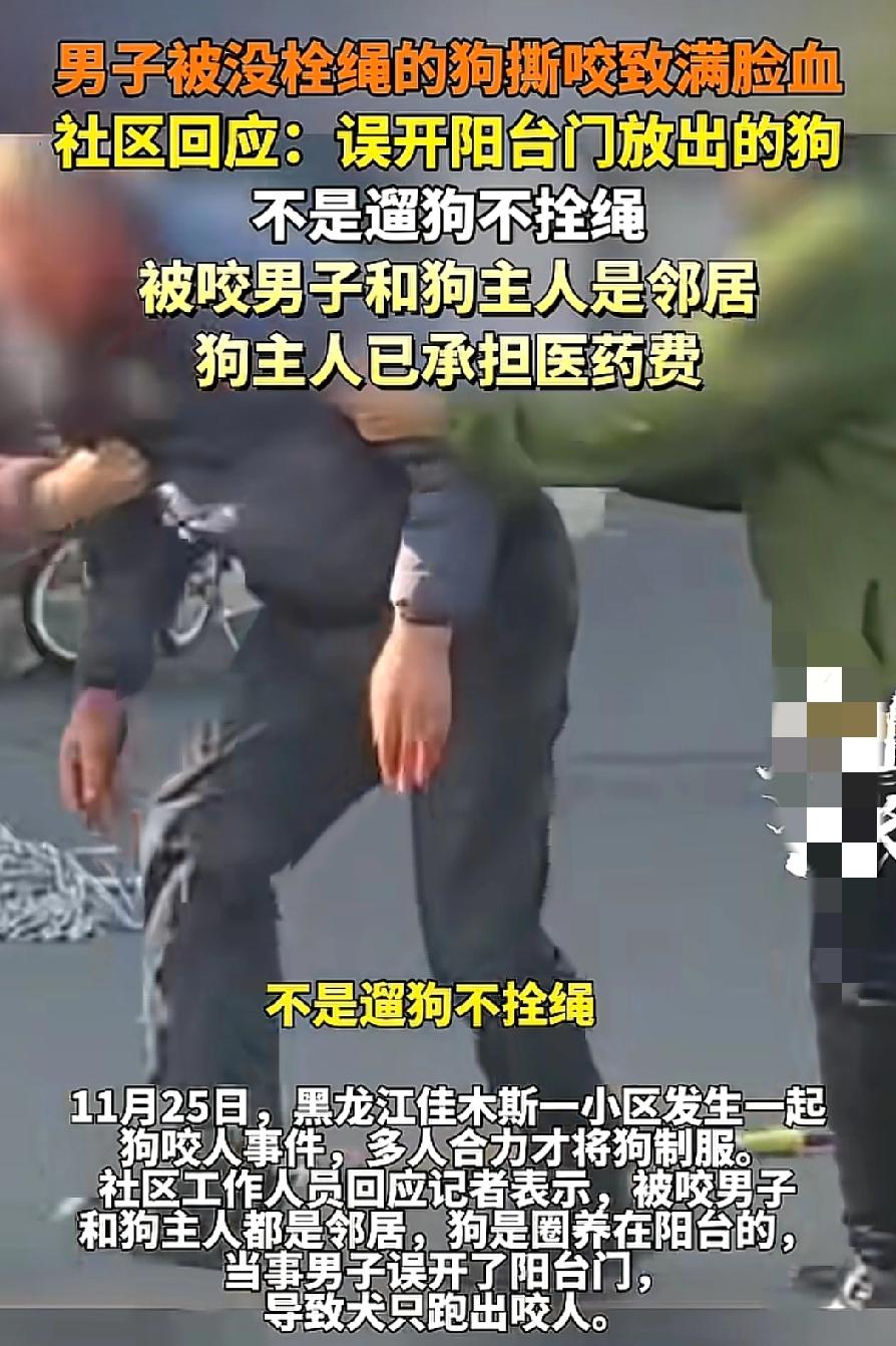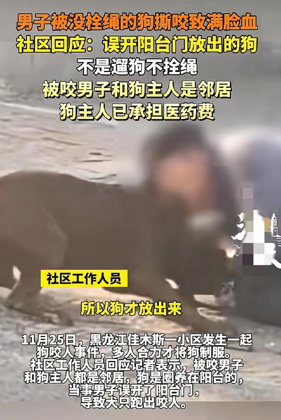 “这真是太吓人了吧!” 黑龙江佳木斯一小区,一男子被没栓绳的狗撕咬得满脸是血,这画面想想都让人揪心! 11月25日,佳木斯这小区里突然传来一阵惨叫。一只没栓绳的大狗扑向一男子,对着脸就疯狂撕咬。 男子疼得在地上直挣扎,脸上瞬间全是血,看着特别吓人。周围邻居听见动静赶紧冲过来,好几个人合力才把狗给制服了。 本以为又是遛狗不拴绳的老问题,结果社区工作人员回应称,被咬男子和狗主人是邻居,狗平时圈养在阳台,是那男子自己误开了阳台门,才把狗放出来咬了人,并非遛狗不拴绳。这说法一出来,有人觉得是狗主人在找借口,也有人觉得这事挺蹊跷。 好在后续处理还算痛快,狗主人立马承担了伤者的全部医药费,男子当天也打了狂犬疫苗,双方没再闹啥异议。 但这事也给咱们敲了警钟。养宠物的人得把自家宠物看好,该圈养的圈养、该拴绳的拴绳,别给别人留隐患。邻居之间也得多留个心眼,别人家的门别随便开,尤其是养着宠物的人家。 你说要是当时狗主人把阳台门关得死死的,或者那男子不随便开邻居家的阳台门,还会有这糟心事吗? 所以说不管是养狗的还是邻居,都得守好自己的“责任门”,不然出了事,麻烦事够让人头疼的。大家觉得这事到底该怪谁呢? 未牵绳狗伤人 无绳狼狗伤人