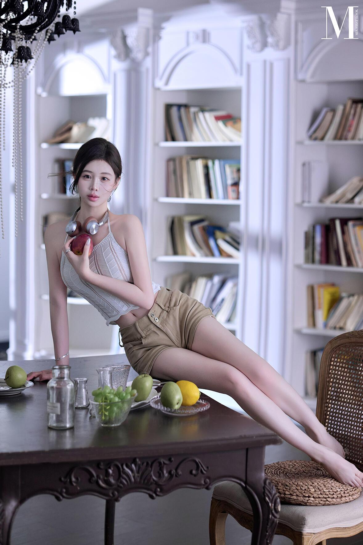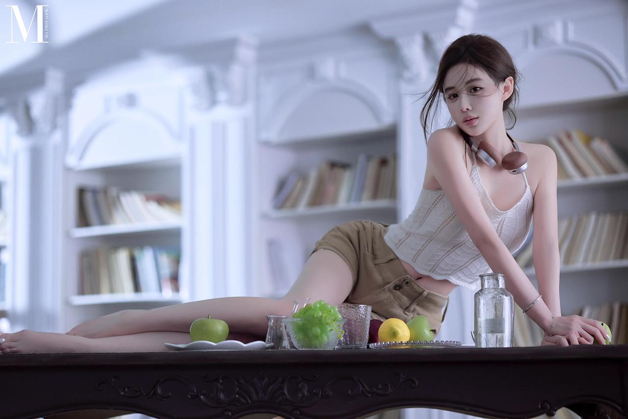她斜倚在雕花木桌旁,像一首未完成的十四行诗。 - 米白色针织吊带上衣勾勒出轻盈的曲线,卡其色短裤下,长腿如舒展的缎带,随意搭在藤编坐垫上。 - 冬日生活打卡季
