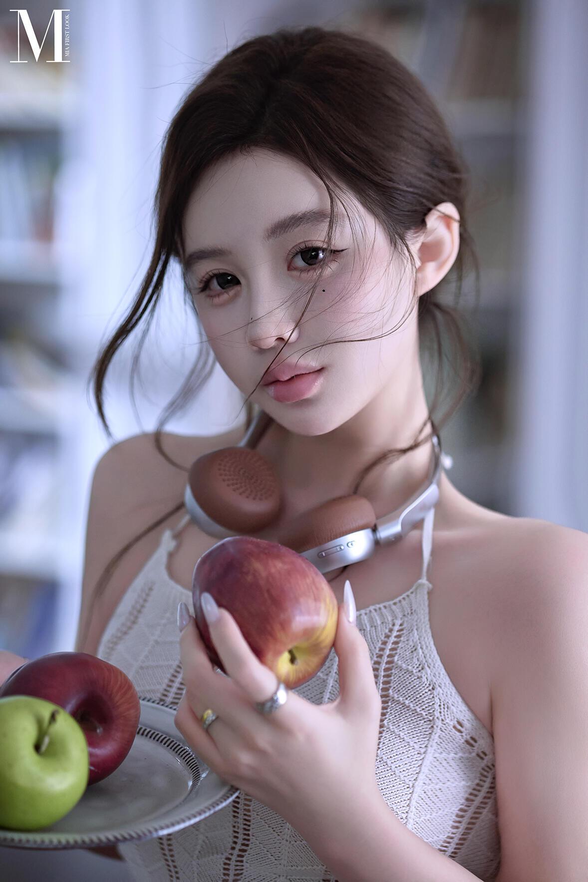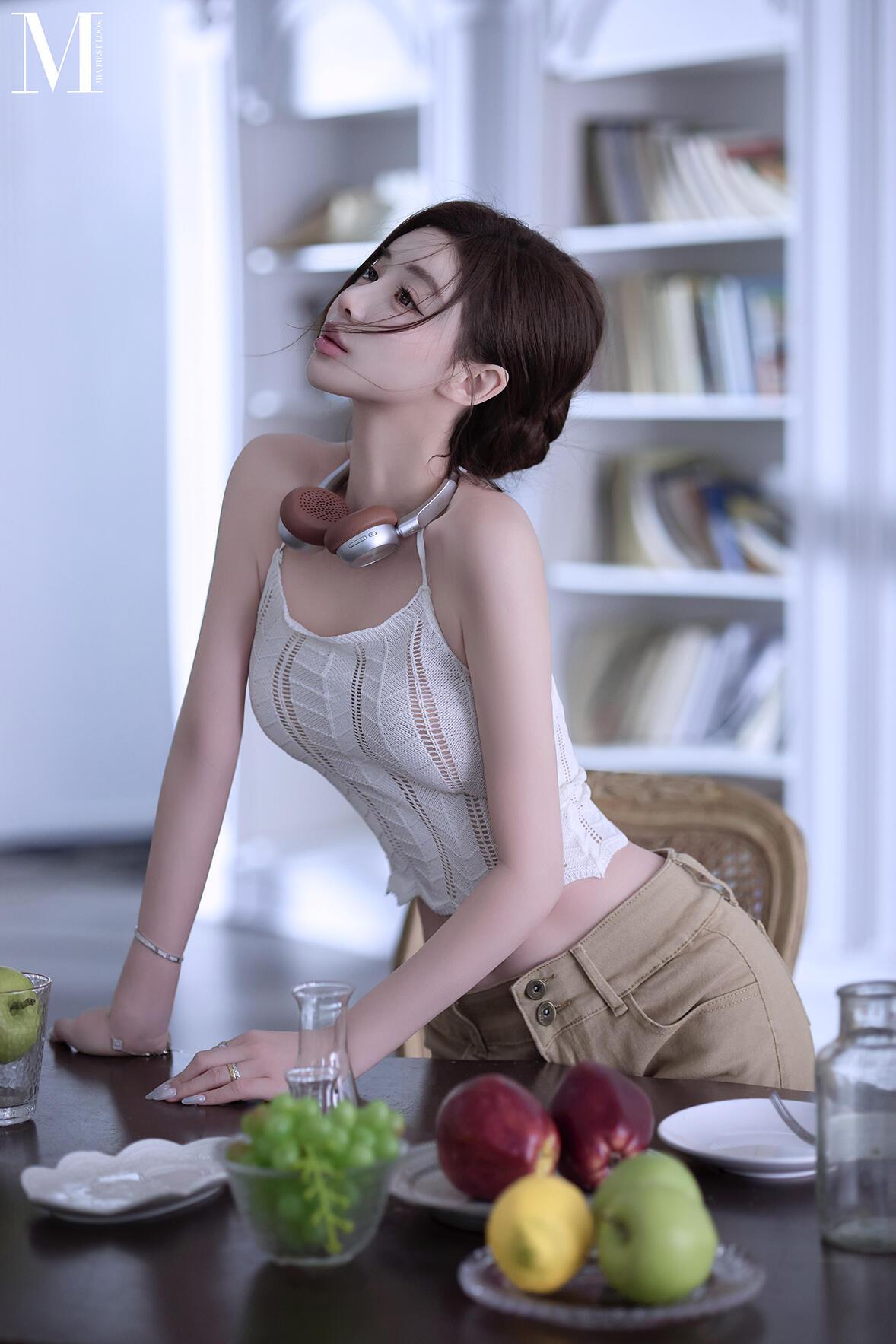 她斜倚在雕花木桌旁,像一首未完成的十四行诗。 - 米白色针织吊带上衣勾勒出轻盈的