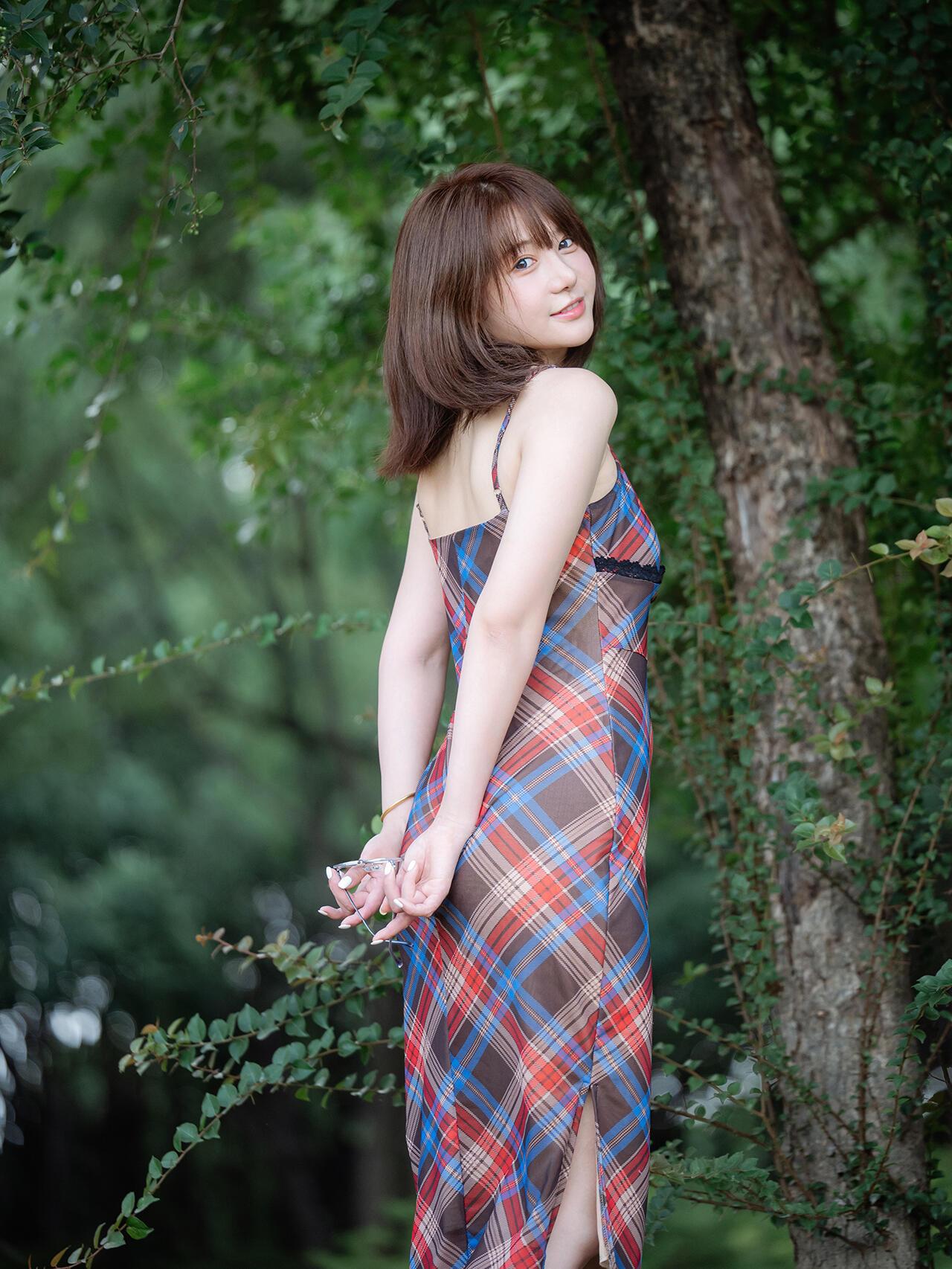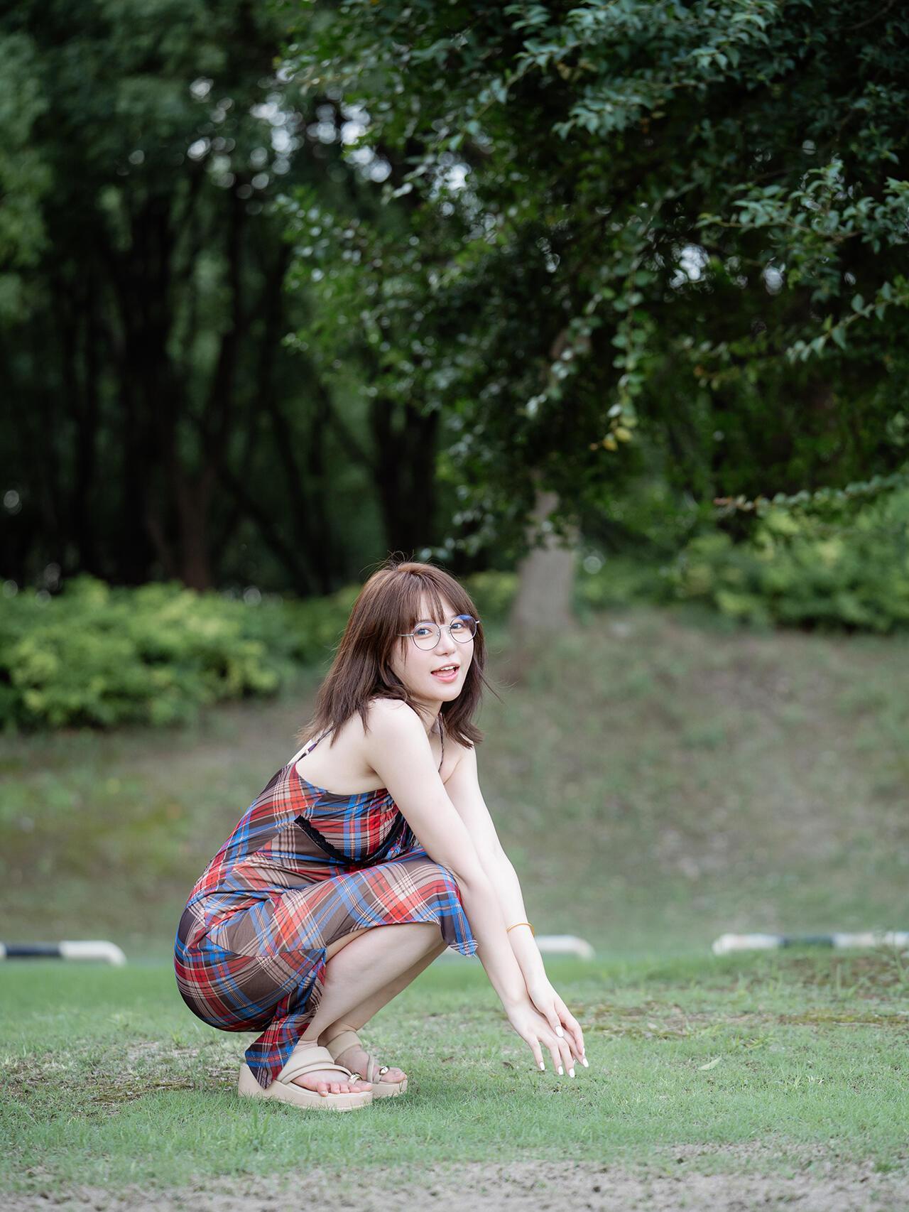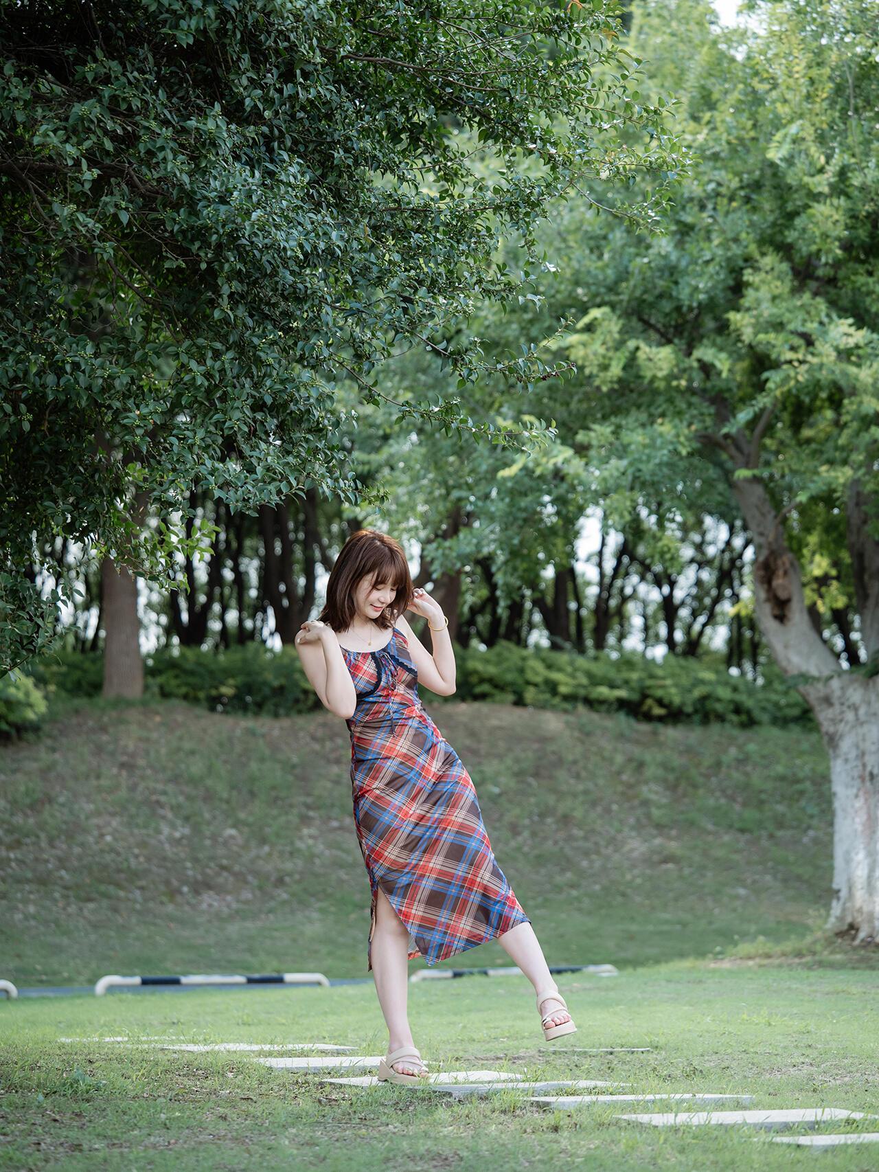 夏末的风裹着草木香,格子裙在长椅边漾开松弛的褶皱。 - 抬眼时是清透的笑意,低头时指尖碰着软草地。连光斑都慢下来,揉进这帧不慌不忙的温柔里。 .
