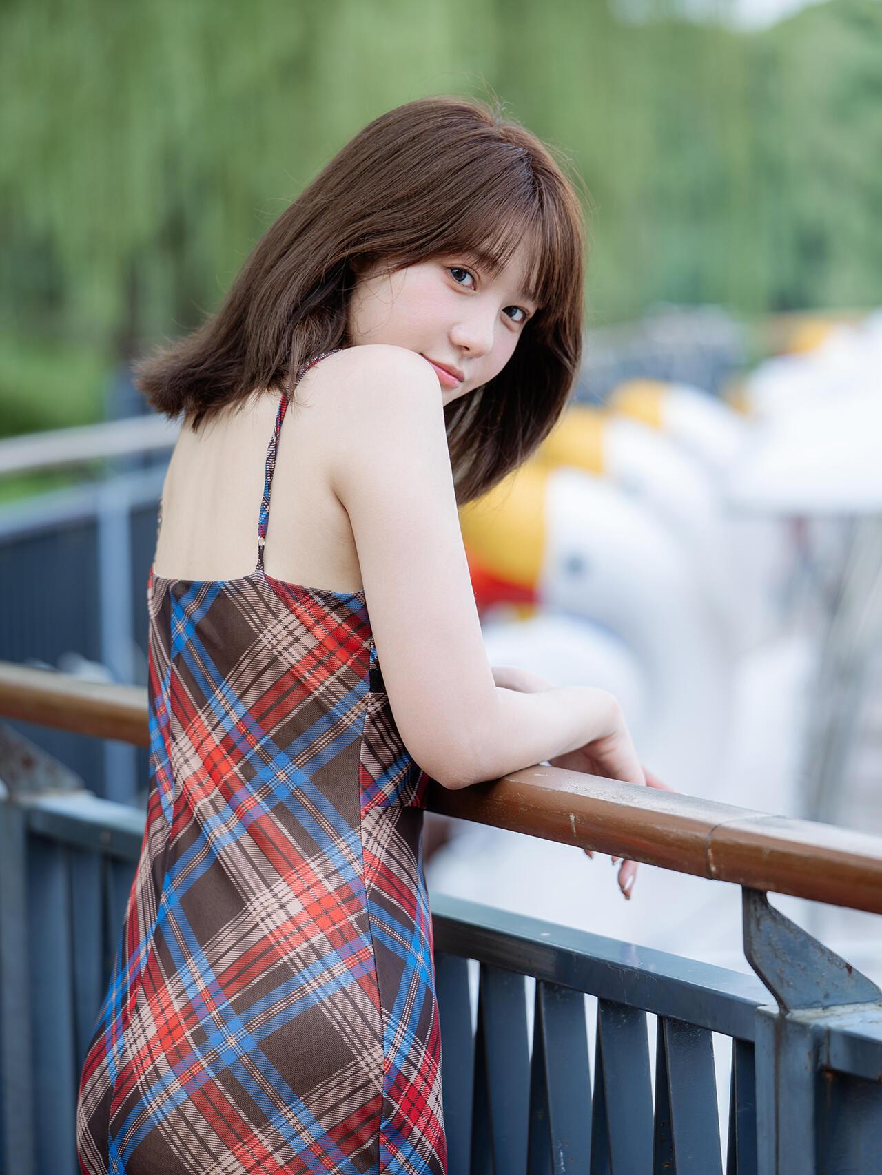 夏末的风裹着草木香,格子裙在长椅边漾开松弛的褶皱。 - 抬眼时是清透的笑意,低头