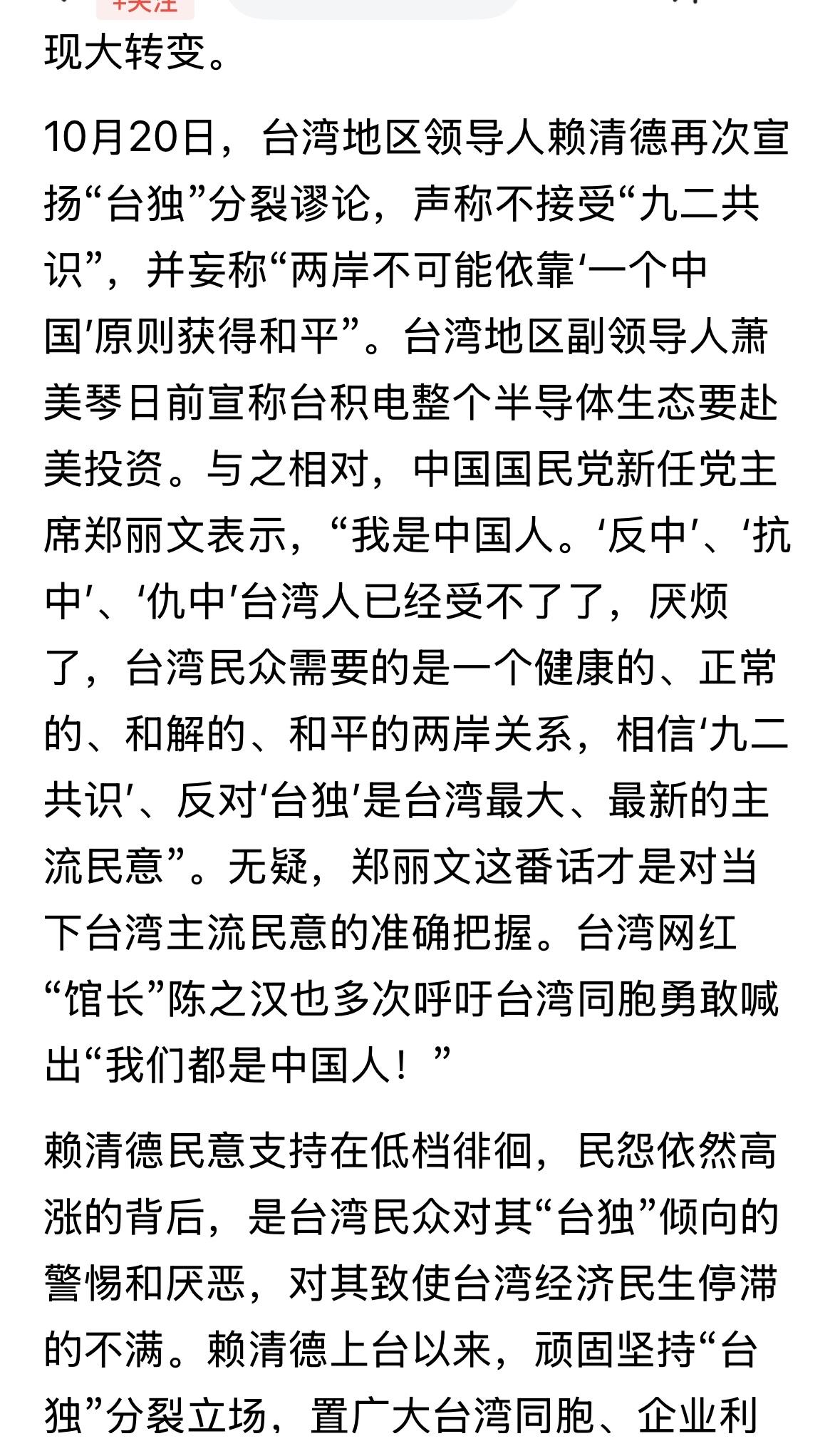 继续努力,向往统一的人越来越多,谁不想过和平安稳幸福的好日子啊!高志凯说的没有一个人愿意统一的情况,绝对是胡说八道,无稽之谈、别有用心!“一国两制、和平统一”是我基本国策,寄希望于台湾人民的方针决不改变!祖国统一的日子正在向我们走来。#祖国统一##热点观点#