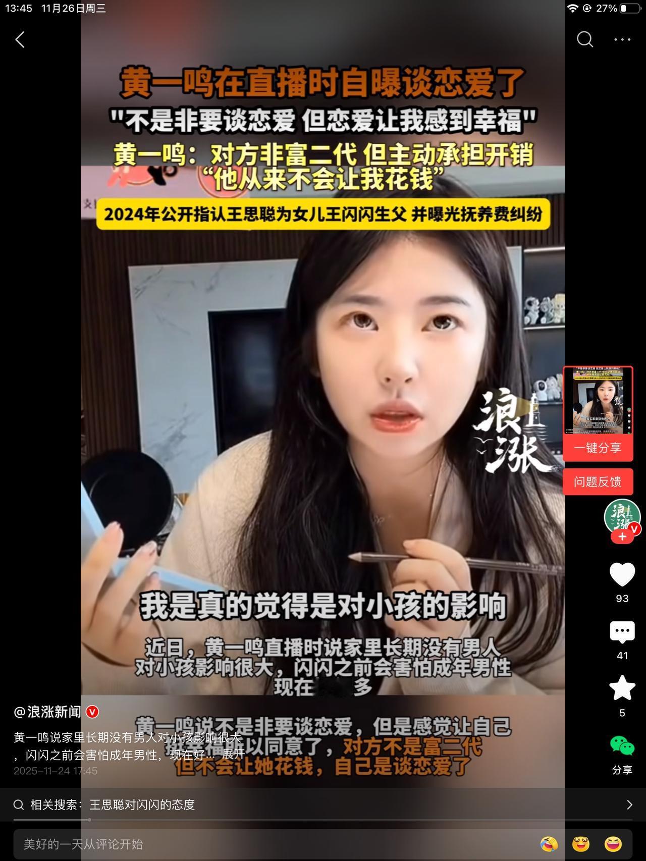 黄一鸣自曝又谈恋爱了! 恋爱很好,没必要给谁守一辈子。何况那个人人家从来没有停止过爱别人的脚步。 黄一鸣说,孩子之前会害怕成年男性。对孩子的的确确是有影响的。哪怕不叫爸爸啊,叫叔叔,她知道,家里有一个男性是保护妈妈和自己的。挺好的。而且恋爱的确挺好的。才三十几岁,当然可以有自己的感情。 之前谁错了,都放过对方吧!是不是富二代不重要,能挣钱,能养活你们娘俩,一起吃饭一起生活,过日子不就是柴米油盐酱醋茶么?有个人挣一百,给你八十,和挣一百万给你五十,区别大着呢,珍惜当下的每一天吧!
