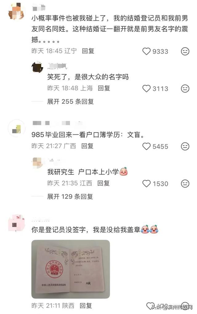 评论区中,不少网友也分享自己遇到的婚姻登记趣事。“你是登记员没签字,我是没给我盖章”、“小概率事件也被我碰到了,我的结婚登记员和我前男友同名同姓。这种结婚证一翻开就是前男友名字的震撼”……