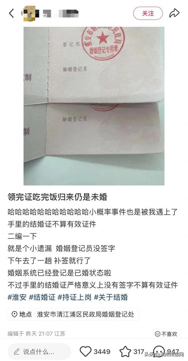 11月25日,江苏淮安一网友发帖分享自己办理婚姻登记时,结婚证上婚姻登记员未签名字。