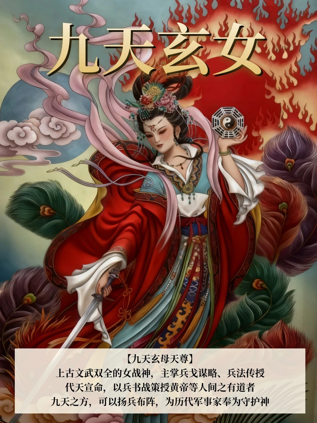 上古文武双全的女战神,主掌兵戈谋略、兵法传授,她代天宣命,以兵书战策授黄帝等人间之有道者。九天之方,可以扬兵布阵,为历代军事家奉为守护神,是「文武双全的战略战神」。