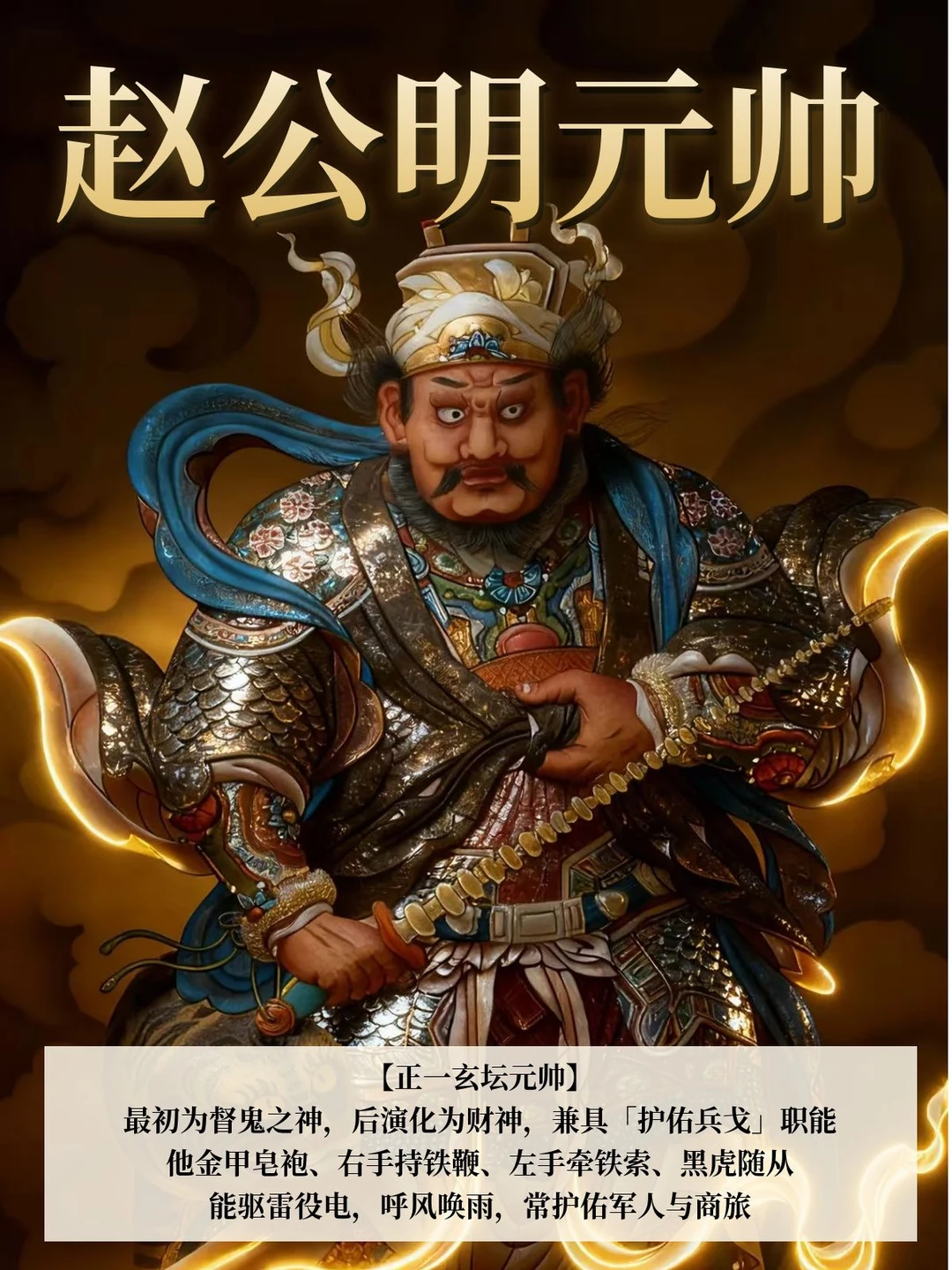 他金甲皂袍、右手持铁鞭、左手牵铁索、黑虎随从,能驱雷役电,呼风唤雨,常护佑军人与商旅,更像是「实用型近战战神」。