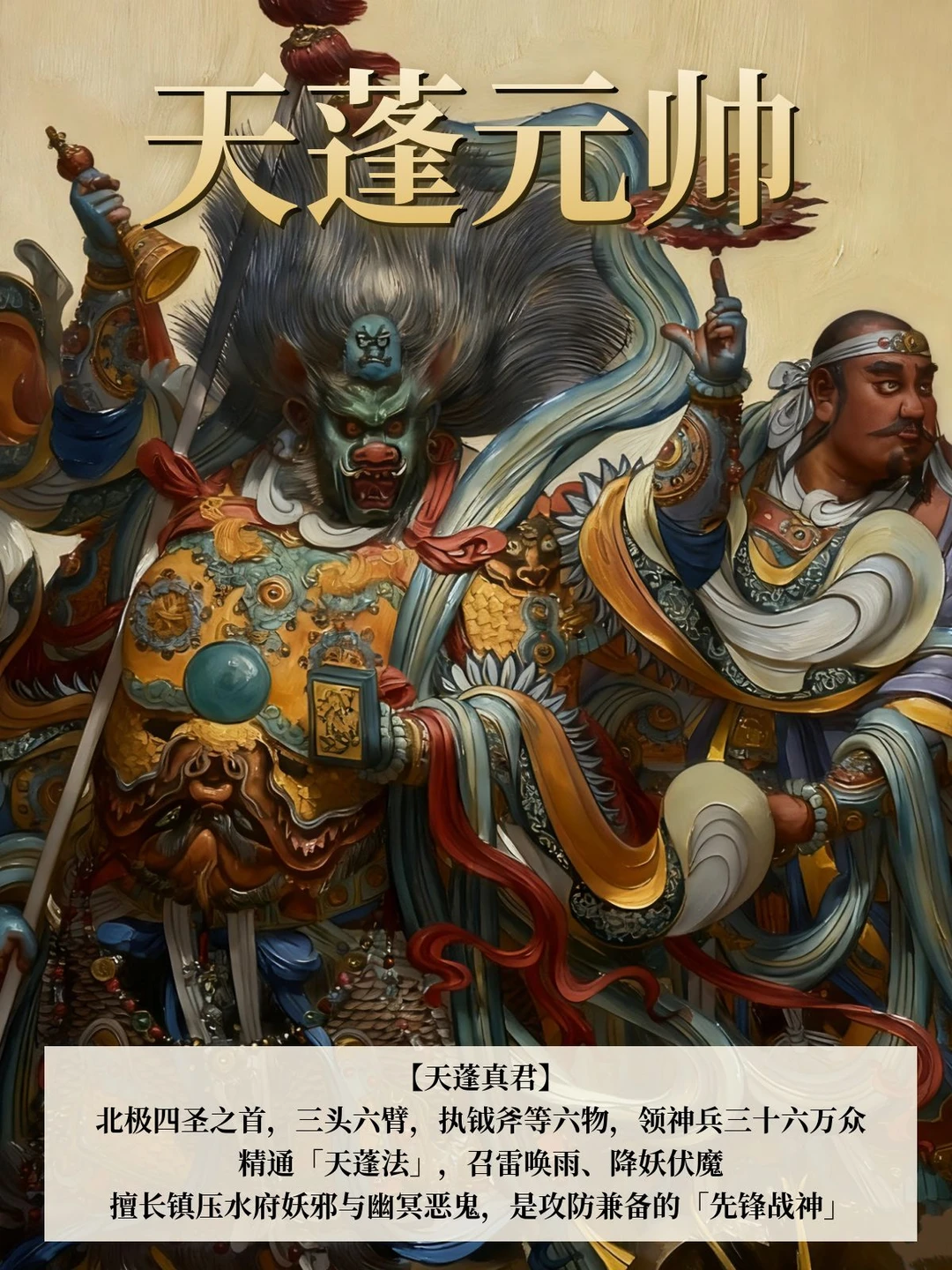 北极四圣之首,三头六臂,执钺斧等六物,领神兵三十六万众,精通「天蓬法」,召雷唤雨、降妖伏魔,擅长镇压水府妖邪与幽冥恶鬼,是攻防兼备的「先锋战神」。