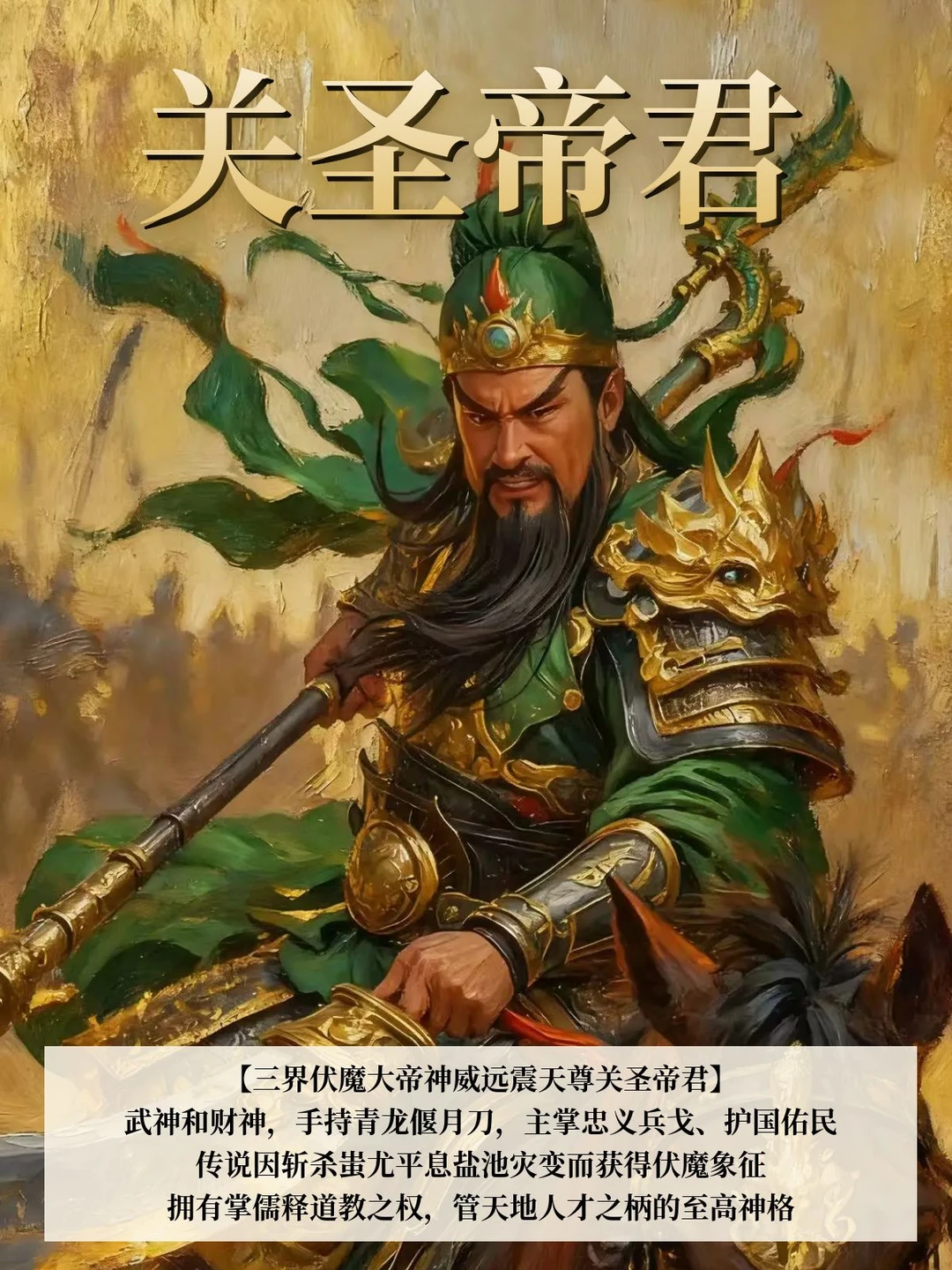 他兼具武神和财神,手持青龙偃月刀,主掌忠义兵戈、护国佑民,传说因斩杀蚩尤平息盐池灾变而获得伏魔象征。拥有掌儒释道教之权,管天地人才之柄的至高神格,是民间最受尊崇的「忠义战神」。