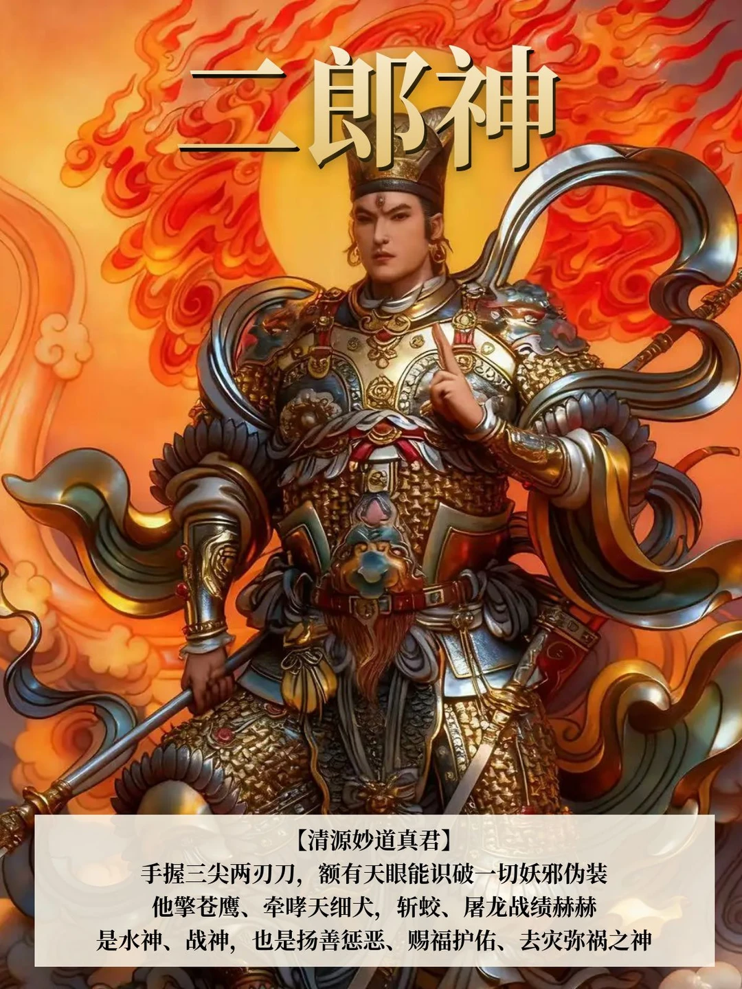 手握三尖两刃刀,额有天眼能识破一切妖邪伪装,二郎神擎苍鹰、牵哮天细犬,斩蛟、屠龙战绩赫赫!是水神、战神,也是扬善惩恶、赐福护佑、去灾弥祸之神,更是「无懈可击的全能战神」。