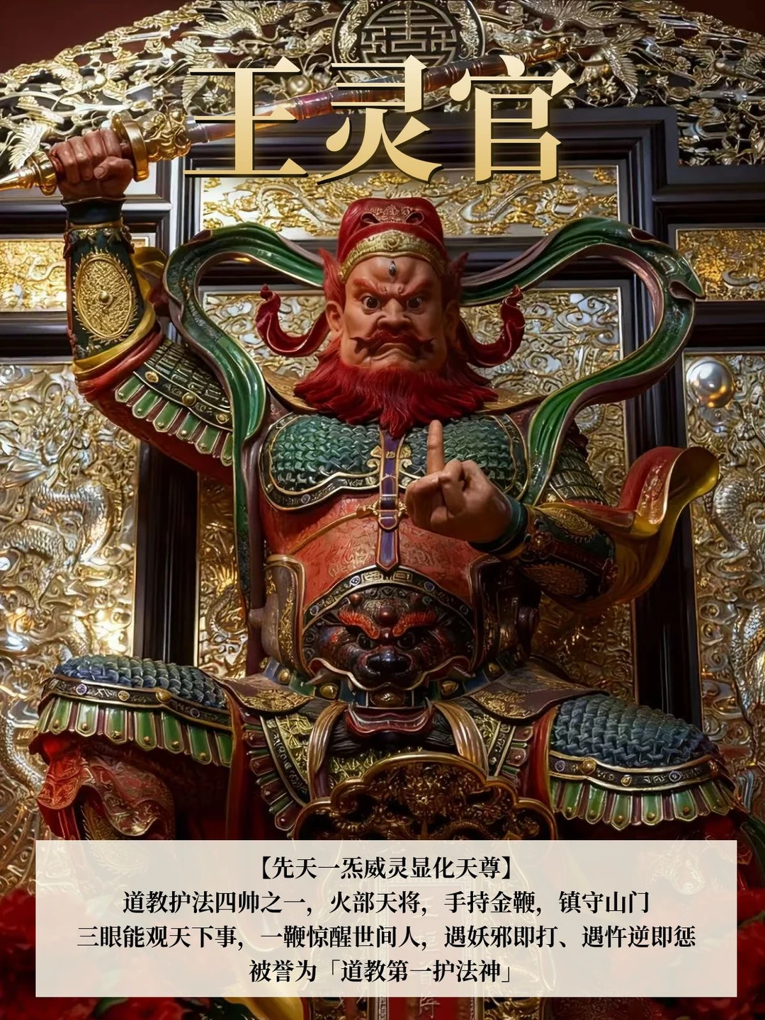 道教护法四帅之一,火部天将,手持金鞭,镇守山门,是天庭「御前战神」,他三眼能观天下事,一鞭惊醒世间人,遇妖邪即打、遇忤逆即惩,被誉为「道教第一护法神」。