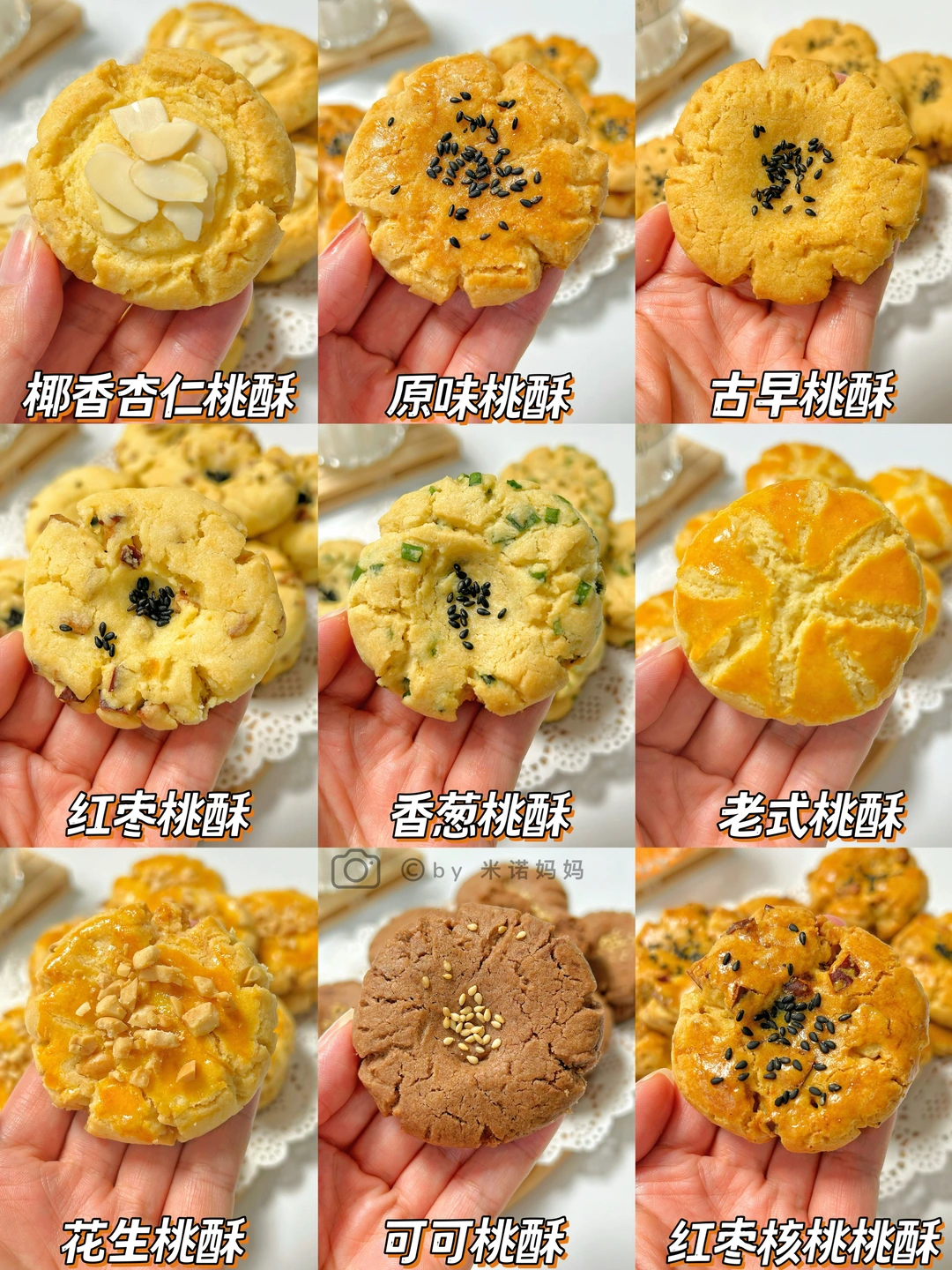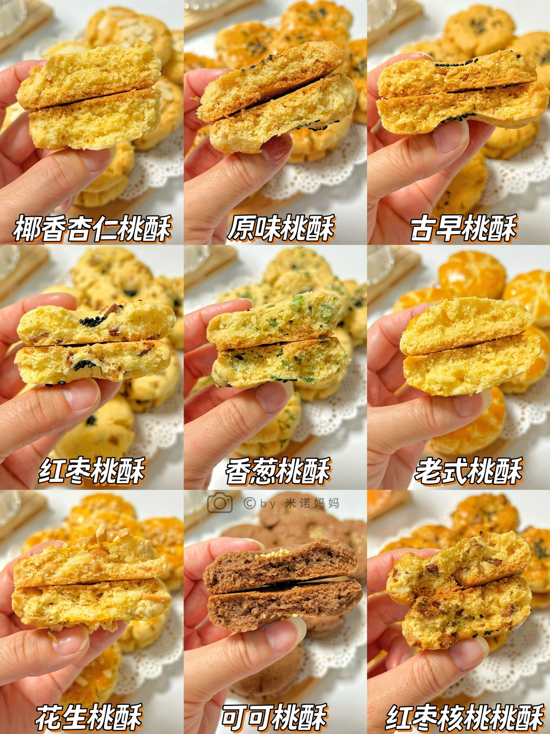 Hi 大家好呀[拥抱R] 分享9款巨好吃的桃酥做法!免打发,做法超简单,烘焙新手一次也能成功!每款都酥到掉渣,好吃不腻,大人小朋友都超爱吃,学会了再也不用出去买啦,快换着口味安排起来吧[派对R] - 🥥椰香杏仁桃酥 🍪原味桃酥 🧇古早桃酥 🍒红枣桃酥 🥬香葱桃酥 🥨老式桃酥 🥜花生桃酥 🍫可可桃酥 🌰红枣核桃桃酥 👩🏻🍳具体教程请看图文哦~ 🔸口感是微甜哦,喜甜糖可多加~ 🔸烤箱温度与时间根据自家烤箱脾气做调整~ 🔸吃不完的装袋子可放三天哦~ - 等大家交作业啦!咱们下期见👋🏻