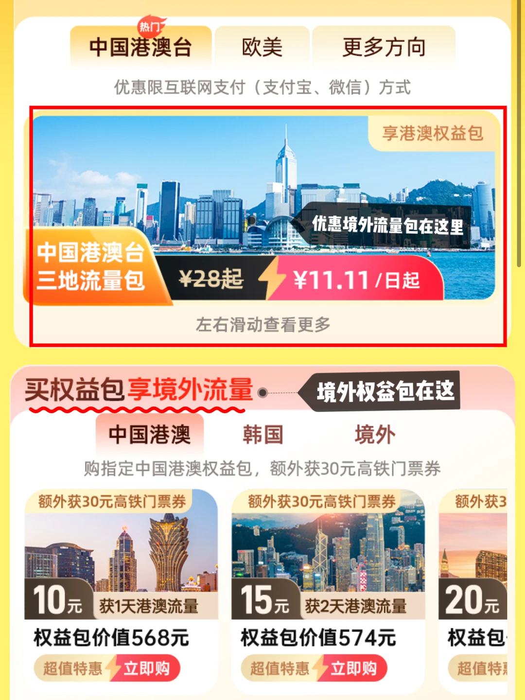 上网流量也可以直接在APP买,不用换卡很方便,香港权益包10元/天,除了有2GB流量外,还会赠送酒店、高铁、巴士券等,除了港澳,有其他出行国家需求的都可以看看,覆盖范围广。