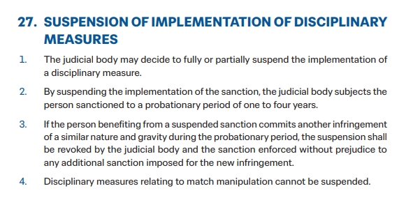 国际足联纪律条例第27条中写道:关于纪律处分的缓期执行——