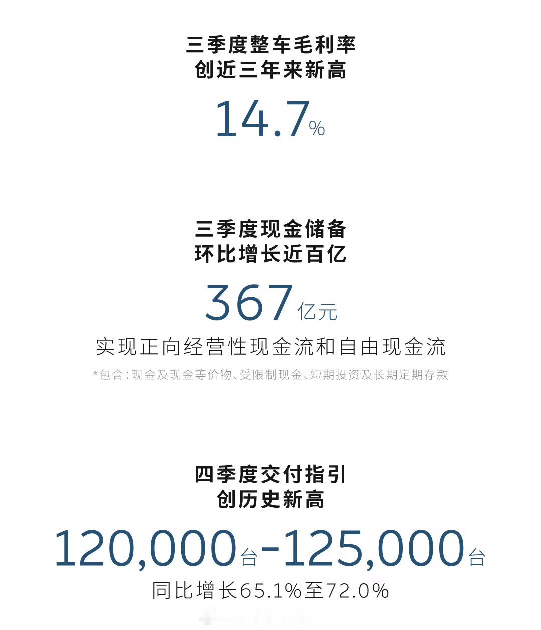 蔚来2025年三季度财报蔚来第三季度净亏损34.8亿,第四季度还能盈利吗?蔚来刚刚发布的财报,好消息还是很多的,蔚来公司三季度交付87,071台,同比增长40.8%,环比增长20.8%,创历史新高。三季度营收217.9亿元,同比增长16.7%,环比增长14.7%,创历史新高。三季度综合毛利率13.9%,创近三年来新高,一堆创历史新高。还有三季度整车毛利率14.7%,创近三年新高。三季度现金储备367亿元,环比大幅增长近百亿。四季度交付指引120,000台至125,000台,同比增长65.1%至72.0%,创历史新高。都是新高,但是三季度还是亏了34.8亿,不过好消息是同比收窄31.2%,Q2季度的净亏损是49亿,按这个亏损收窄幅度,想要在四季度实现盈利还是有难度的。不过各种好消息还是很多,车卖得越来越多越来越好,钱也亏得越来越少,就算第四季度还在亏损,在可预见的未来,蔚来只要不出什么昏招,还是能扭亏为盈的。蔚来的未来是真要来了。汽场全开蔚来
