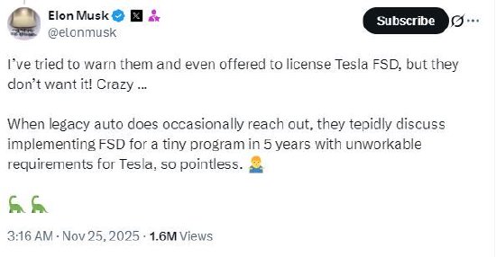 马斯克周二在X上发帖称:“我试着警告他们,甚至提出授权特斯拉FSD,但他们不想要!疯了……