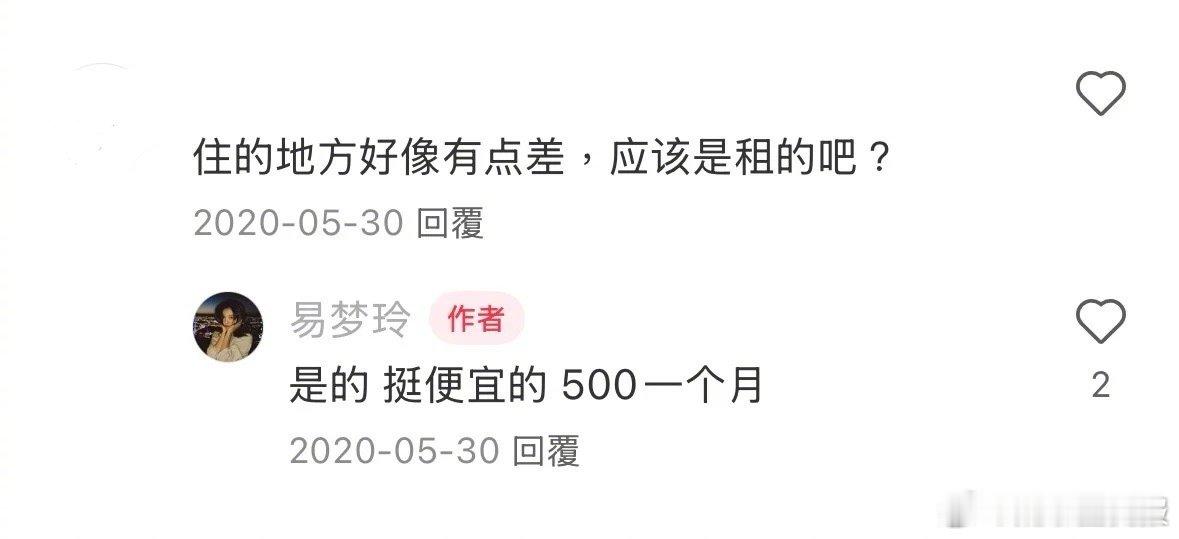 易梦玲曾住月租500元的房子易梦玲10年前私信询问表演培训 有网友整理了易梦玲5年前回复的评论,发现易梦玲10年前就想学表演,曾私信询问北京好的培训机构;5年前还在住月租500的房子。