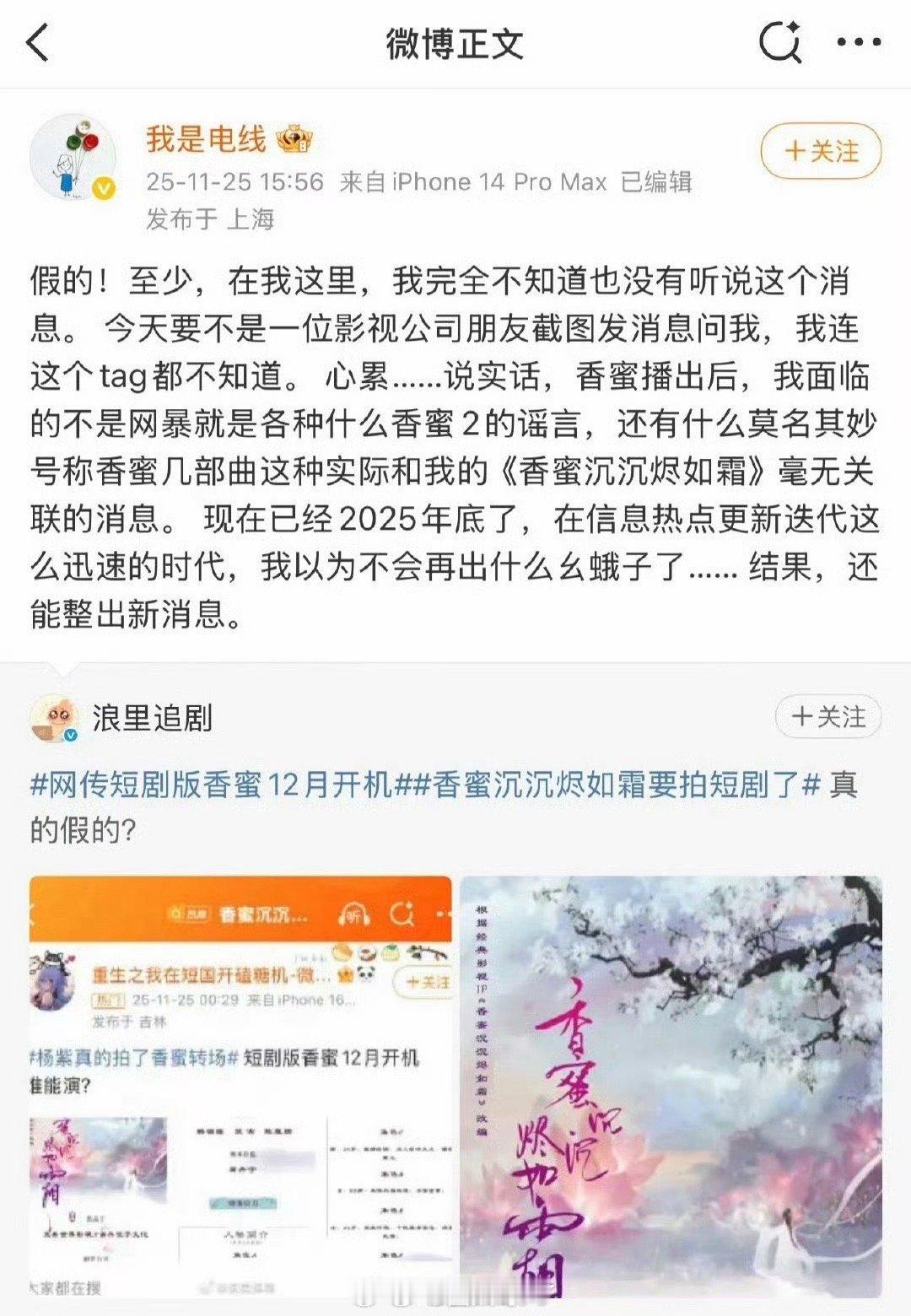 香蜜原著作者电线否认要拍短剧。香蜜制片人刘宁随后发博确认拍短剧。还要重启这个故事,啥情况啊~